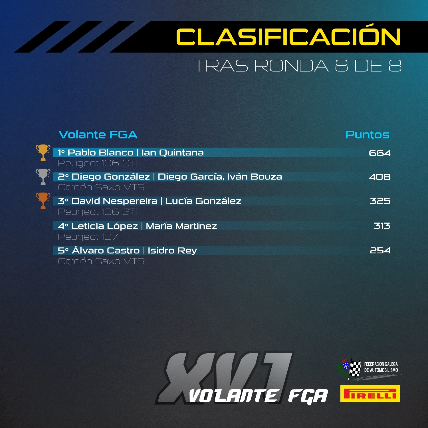 El podio lo completaba Jorge Brenya, contento de terminar un rallye después de varios abandonos consecutivos, mientras Fran Cebey y Leticia López terminaban cerrando el top 5 de este último envite del Volante FGA.