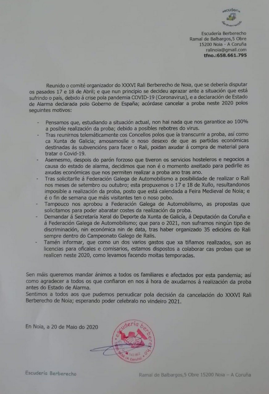 Poco a poco van cayendo las piezas y hoy es el turno de la Escudería Berberecho, que con un comunicado que acaba de publicar en su página web oficial da por cancelada la edición del Rally Berberecho Noia de este año.