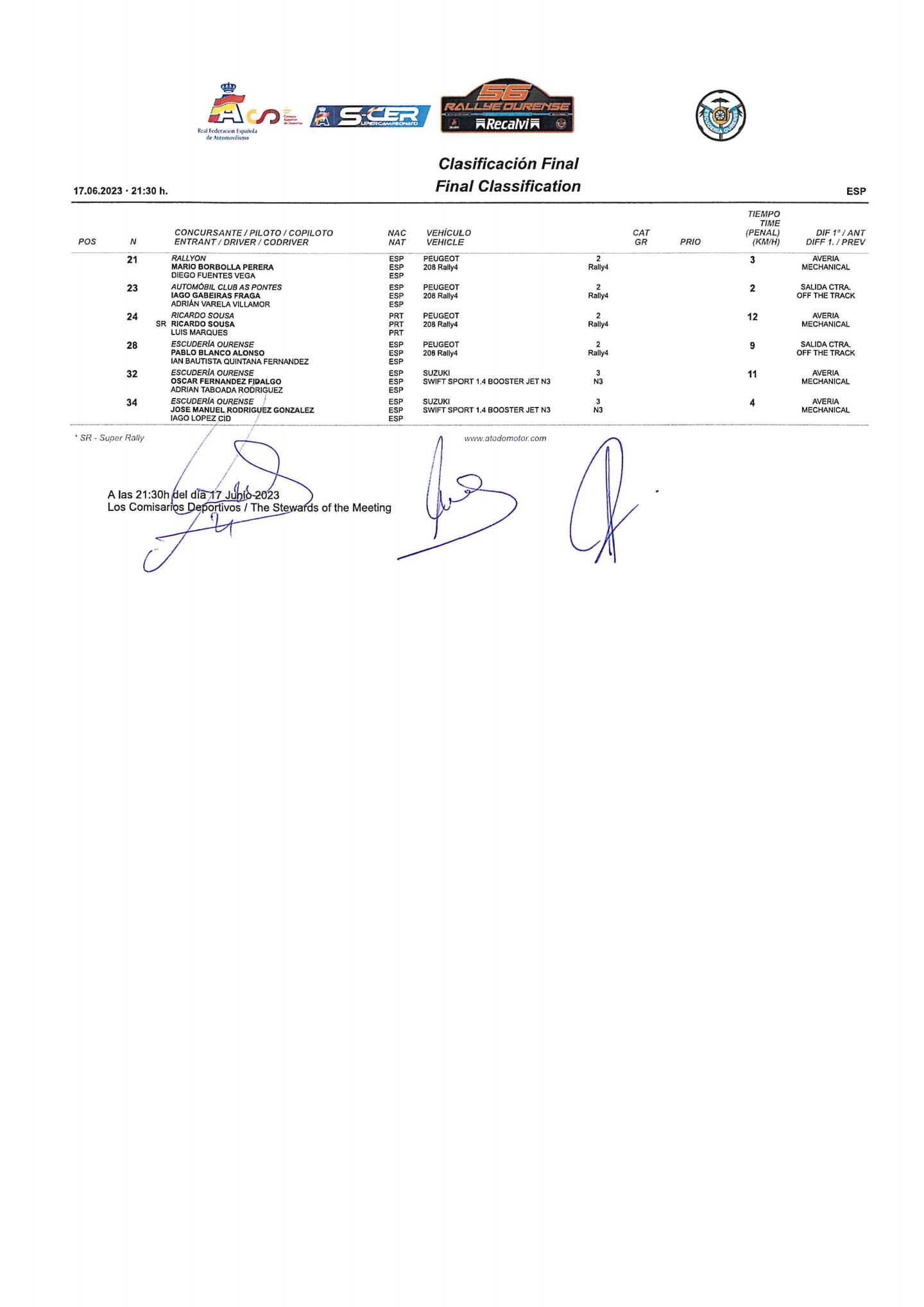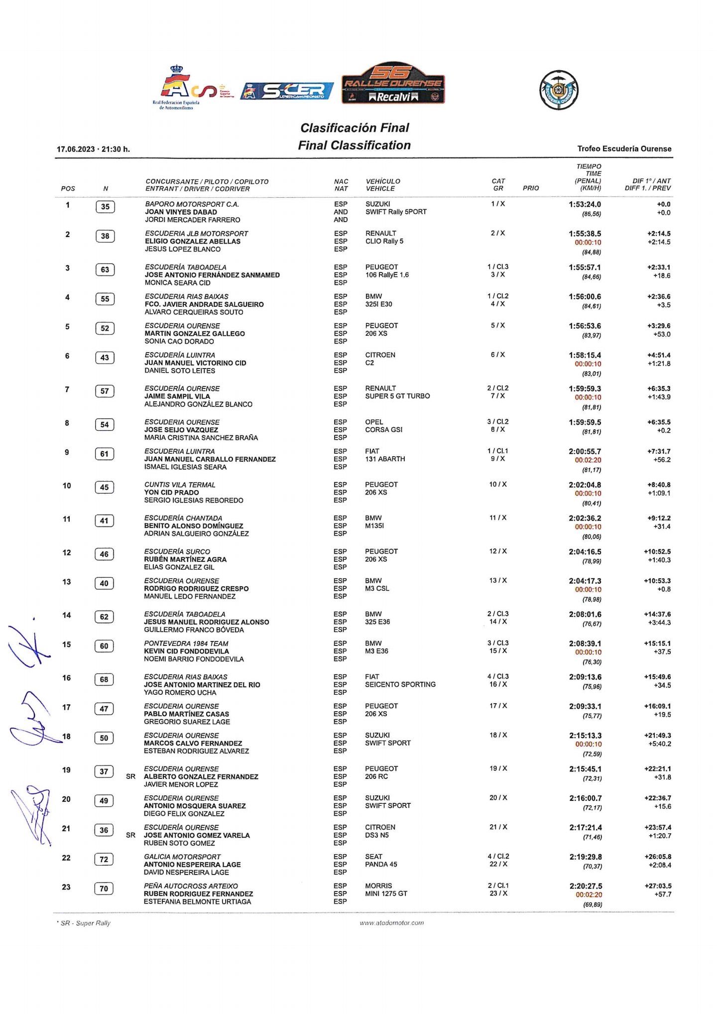 Aqui os dejamos la Clasificación final oficial rally de ourense 2023