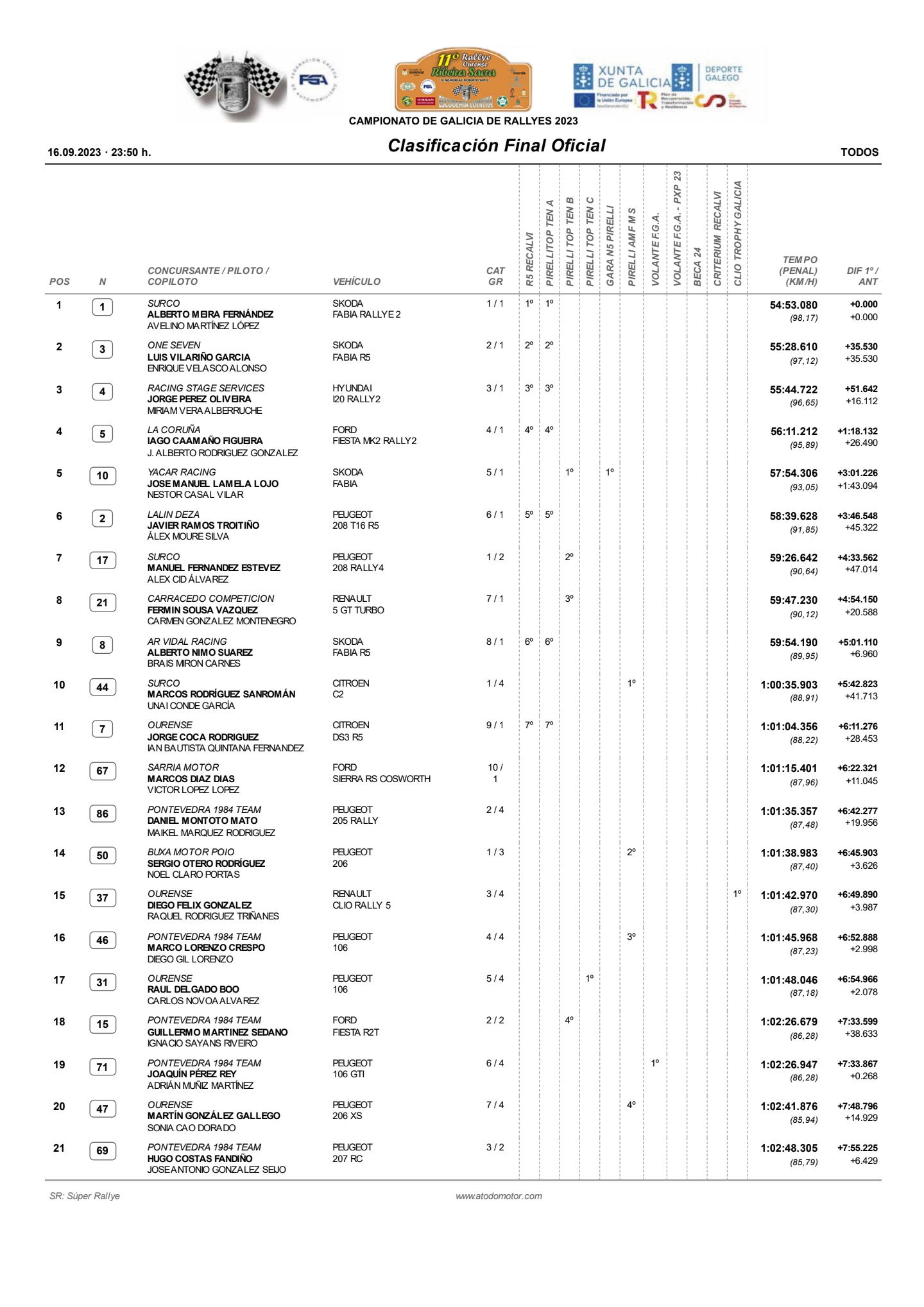 Meira y Martínez no dieron opción a sus rivales durante todo el fin de semana y marcaron un ritmo que ninguno de sus rivales fue capaz de seguir. De esta forma, el piloto de Vincios, continúa con opciones de ser campeón gallego, a la espera de lo que sucedan en las dos últimas citas del certamen.
