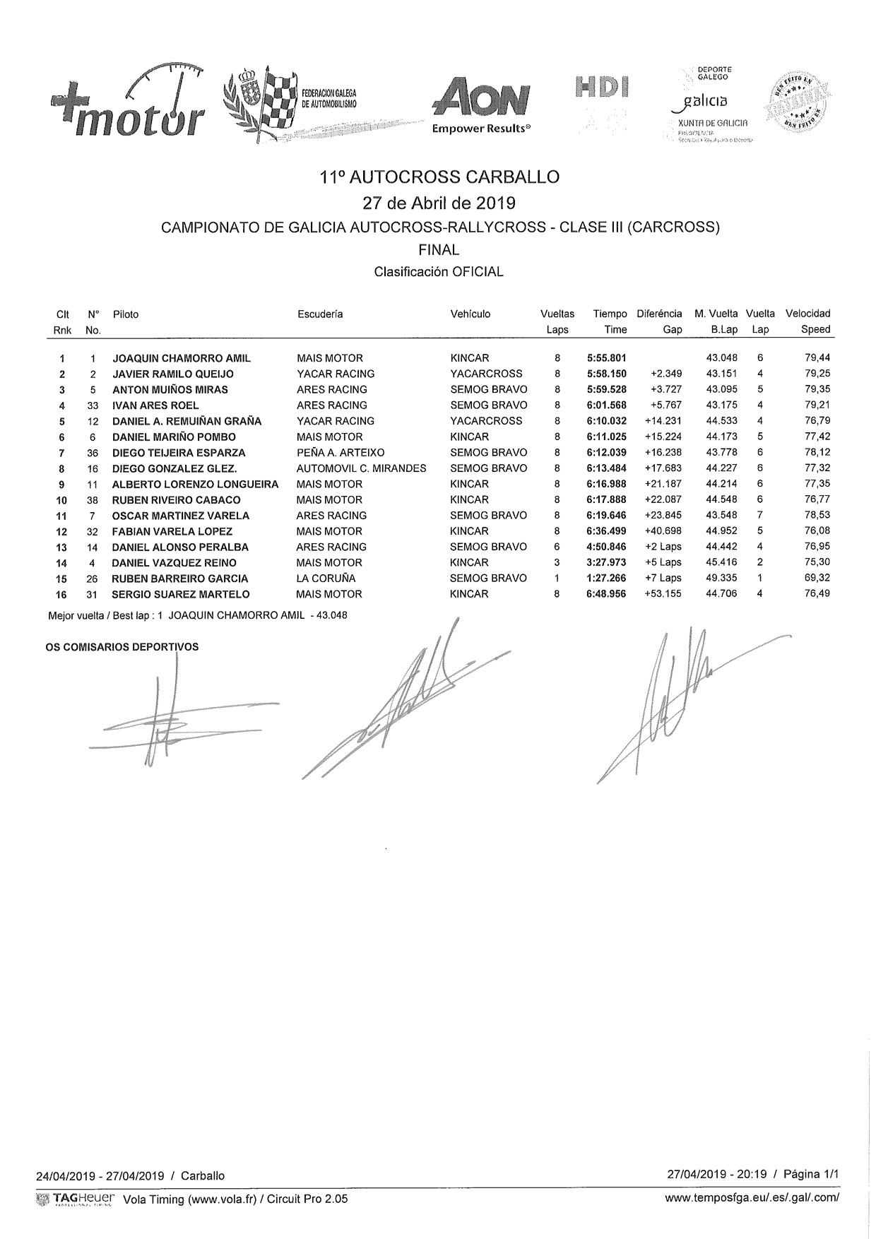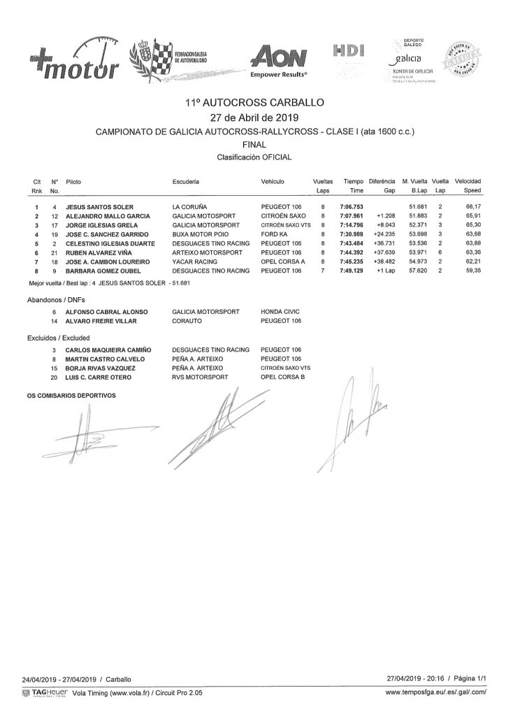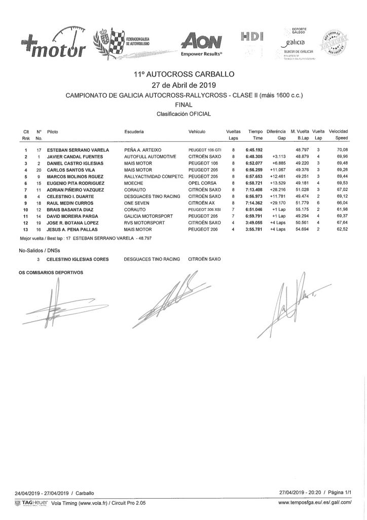 A continuación os dejamos las clasificaciones finales oficiales del 11 Autocross de Carballo 2019 Final Clase I menos 1600 Final Clase II mas 1600 Final Clase III Carcross Navegación de entradas Antón Muíños sube al podio en CarballoJavier Ramilo, segundo en Carballo con el Yacarcross