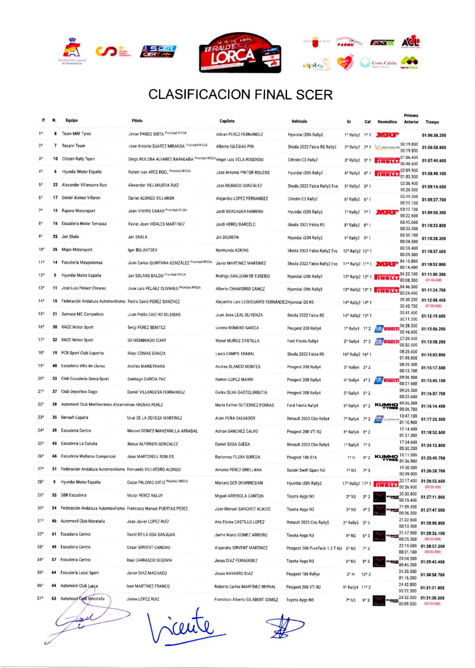 Aquí os dejamos la Clasificación final oficial del Rally Tierras Altas de Lorca 2023