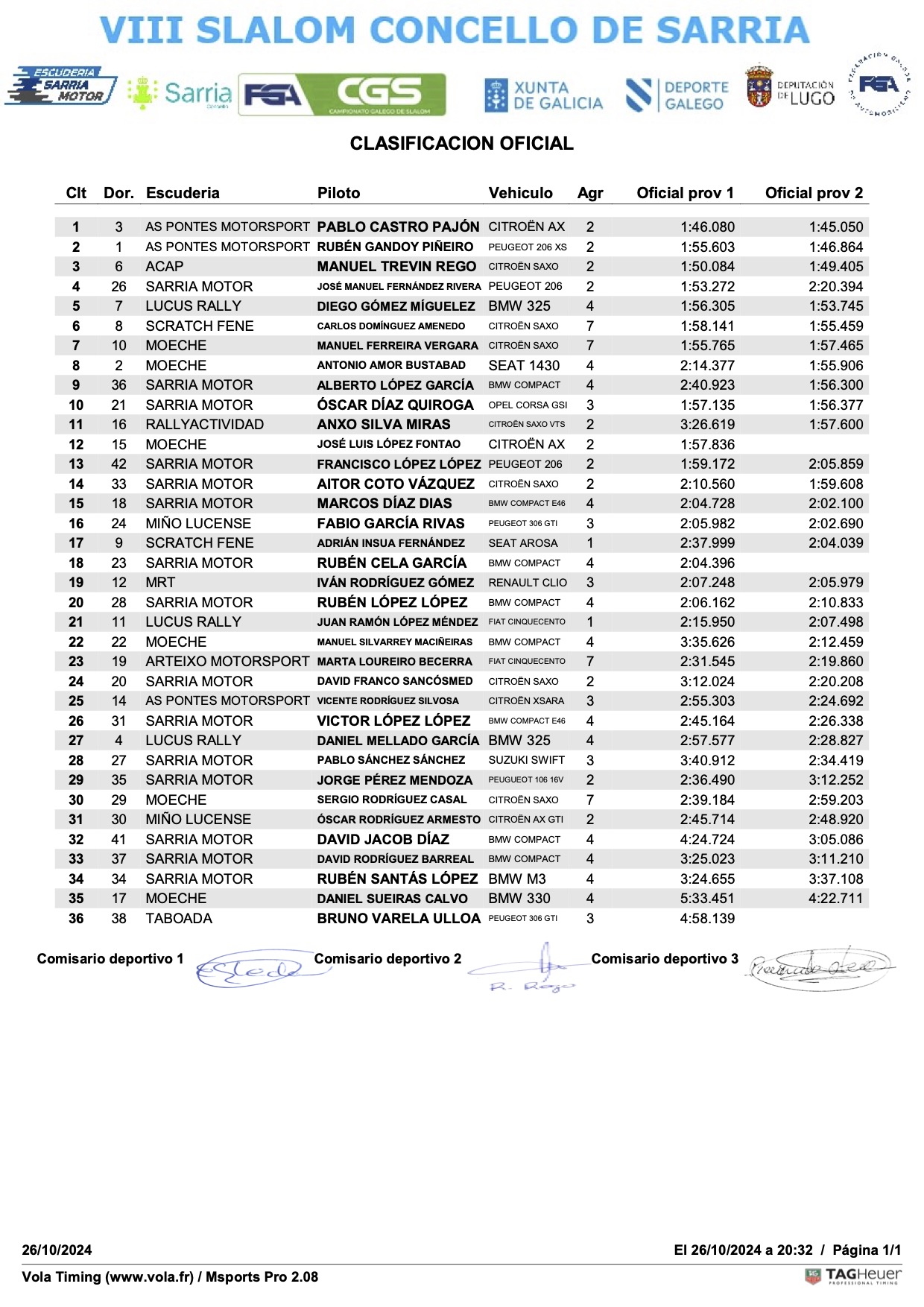 Aquí os traemos la clasificación final oficial del Slalom de Sarria 2024, penultima prueba del Campeonato Gallego de Slalom.
