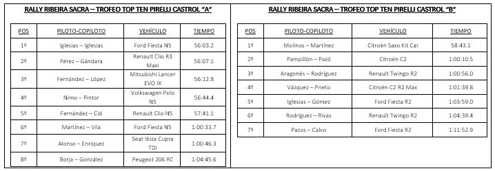 La séptima cita del Campeonato Gallego de Rallies dejó un gran sabor de boca en los “perseguidores” en la clasificación de cada apartado del Trofeo Top Ten Pirelli Castrol, pues en ambos apartados las distancias se han quedado al mínimo tras la cita disputada este fin de semana en los alrededores de la población ourensana de Luintra.
