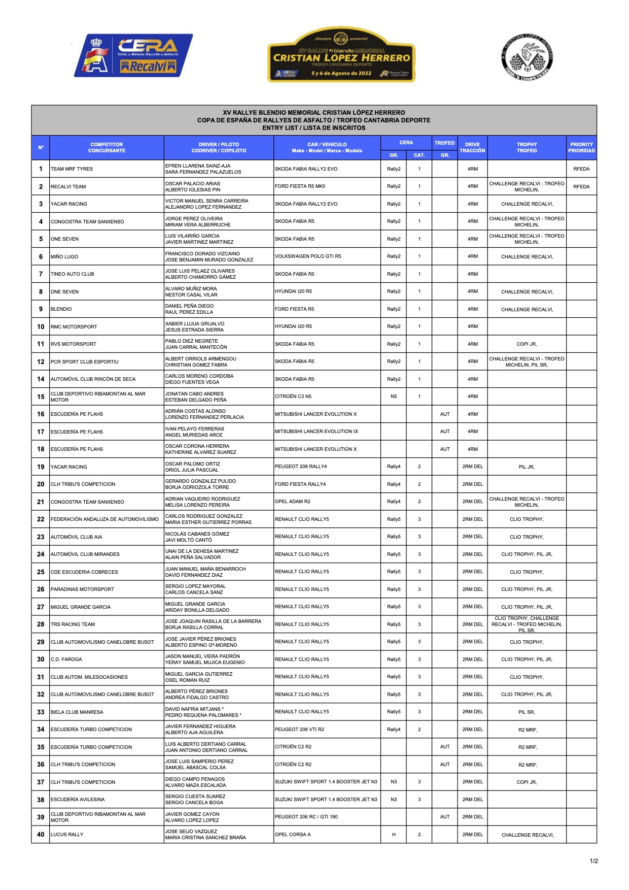 Aquí os dejamos la lista de inscritos oficial del Rally Memorial Cristian Lopez Herrero 2022, prueba puntuable para la Copa de España de Rallyes de Asfalto. Lista de Inscritos Oficial: Compartelo: Haz clic para compartir en Facebook (Se abre en una ventana nueva) Facebook Haz clic para compartir en X (Se abre en una ventana nueva) X Haz clic para compartir en WhatsApp (Se abre en una ventana nueva) WhatsApp Haz clic para compartir en Telegram (Se abre en una ventana nueva) Telegram Haz clic para compartir en Pinterest (Se abre en una ventana nueva) Pinterest Haz clic para enviar un enlace por correo electrónico a un amigo (Se abre en una ventana nueva) Correo electrónico Relacionado Navegación de entradas Clasificación final del Rally de Ourense 2022Lista de Inscritos del Rally de Ferrol – Suzuki 2022