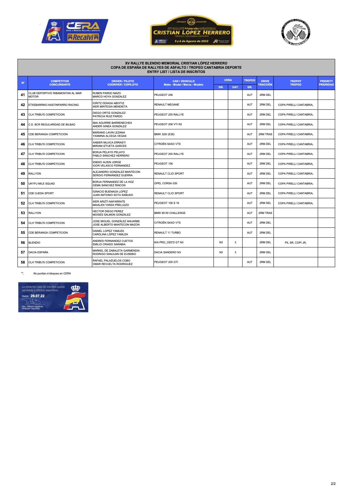 Aquí os dejamos la lista de inscritos oficial del Rally Memorial Cristian Lopez Herrero 2022, prueba puntuable para la Copa de España de Rallyes de Asfalto.
