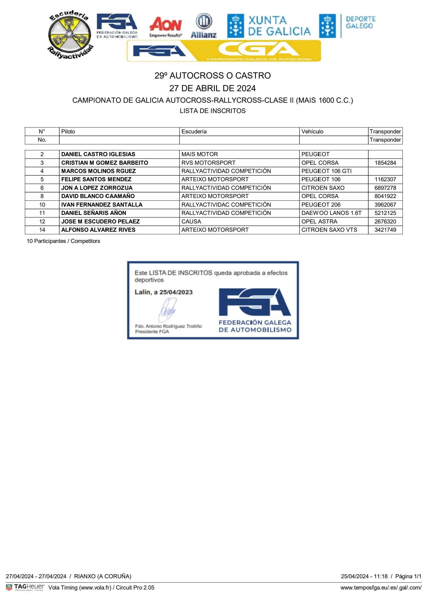 Ya tenemos disponible la lista de inscritos oficial del 29 Autocross de O Castro, prueba inaugural del Campeonato Gallego de Autocross en este año 2024.