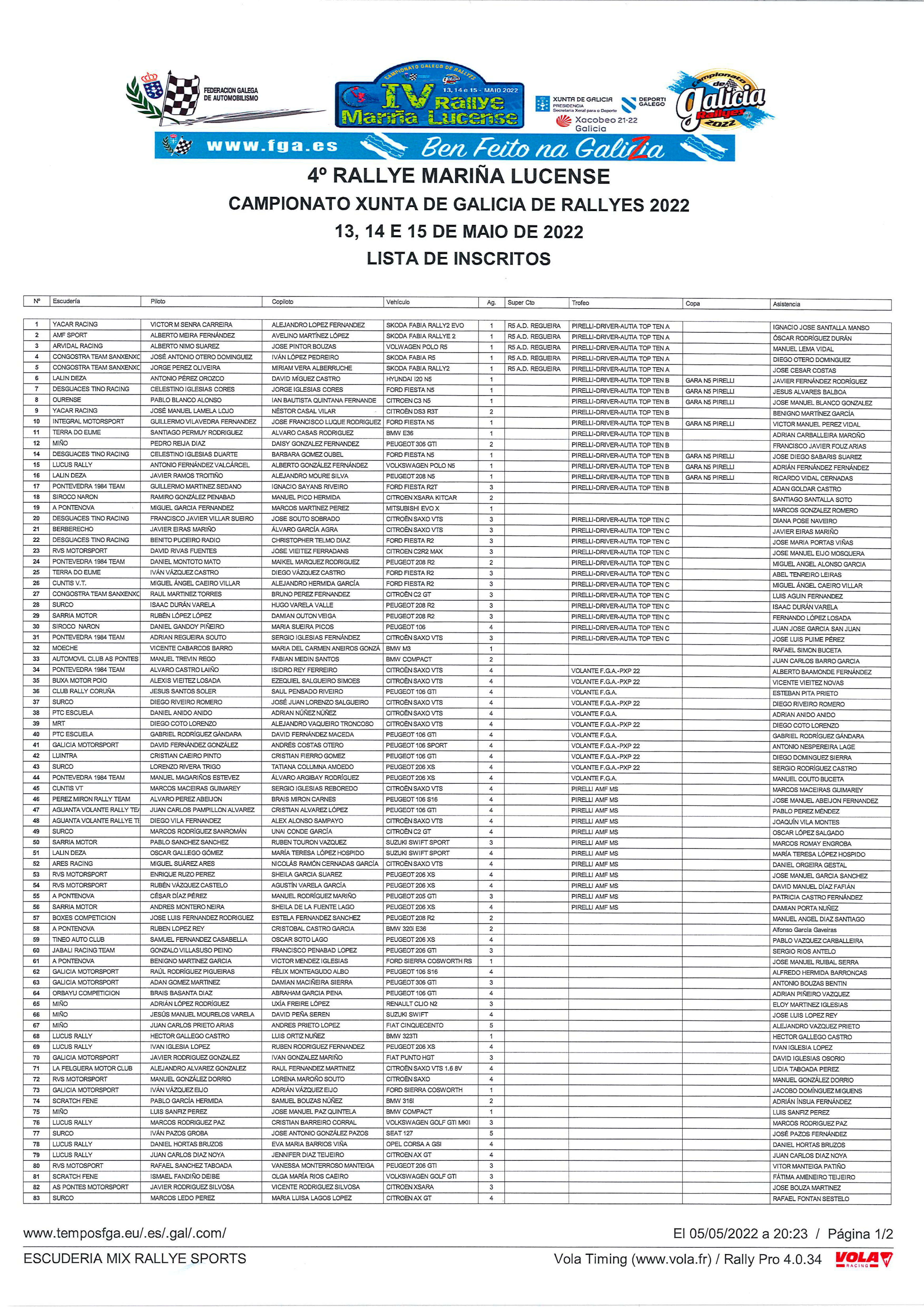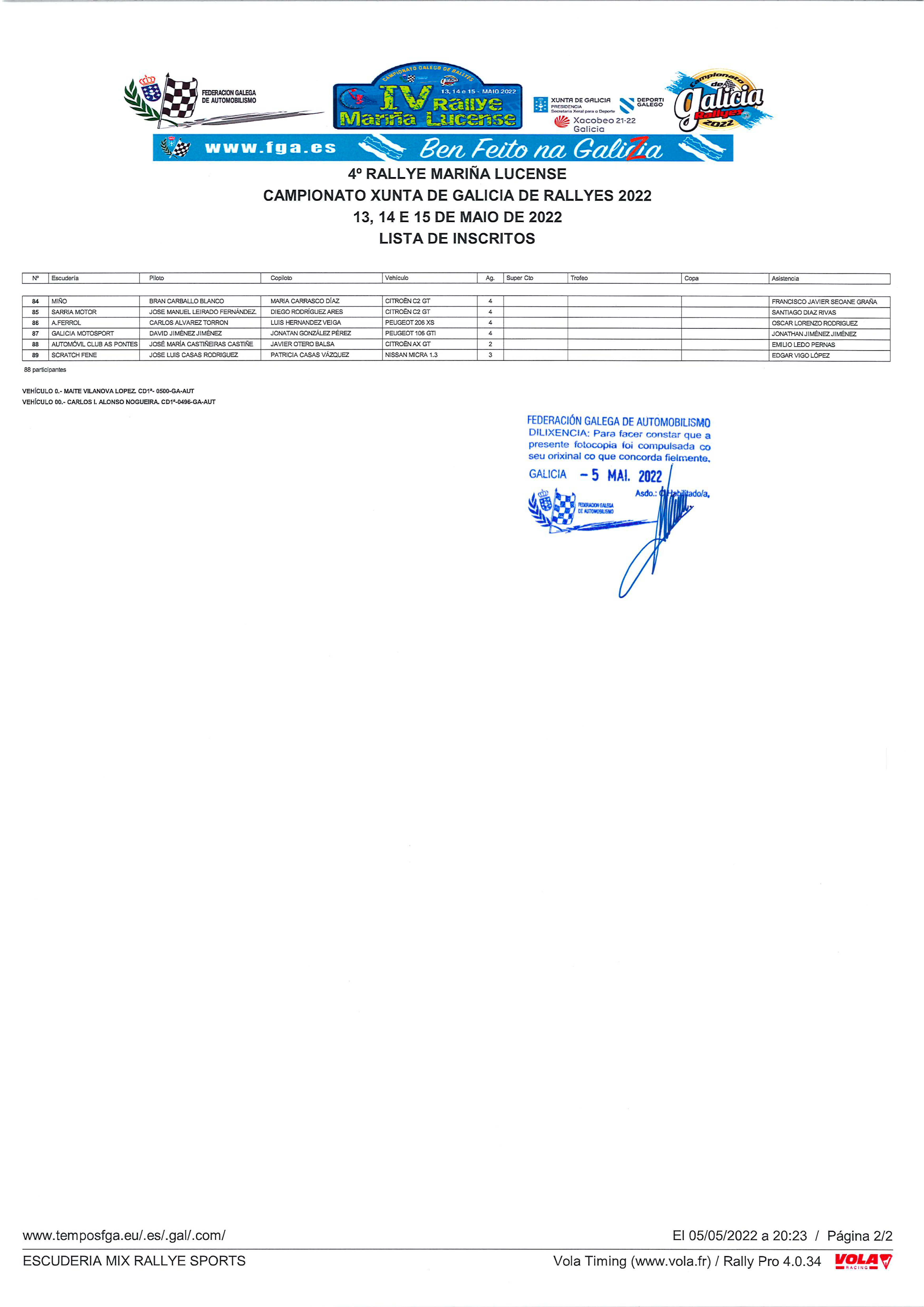 Ya tenemos disponible la lista de inscritos oficial del IV Rally Mariña Lucense 2022, prueba puntuable para el Campeonato Gallego de Rallyes.