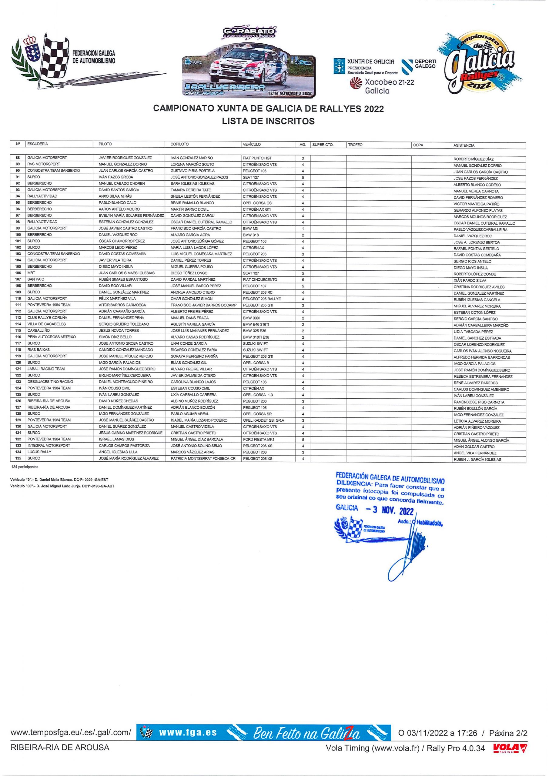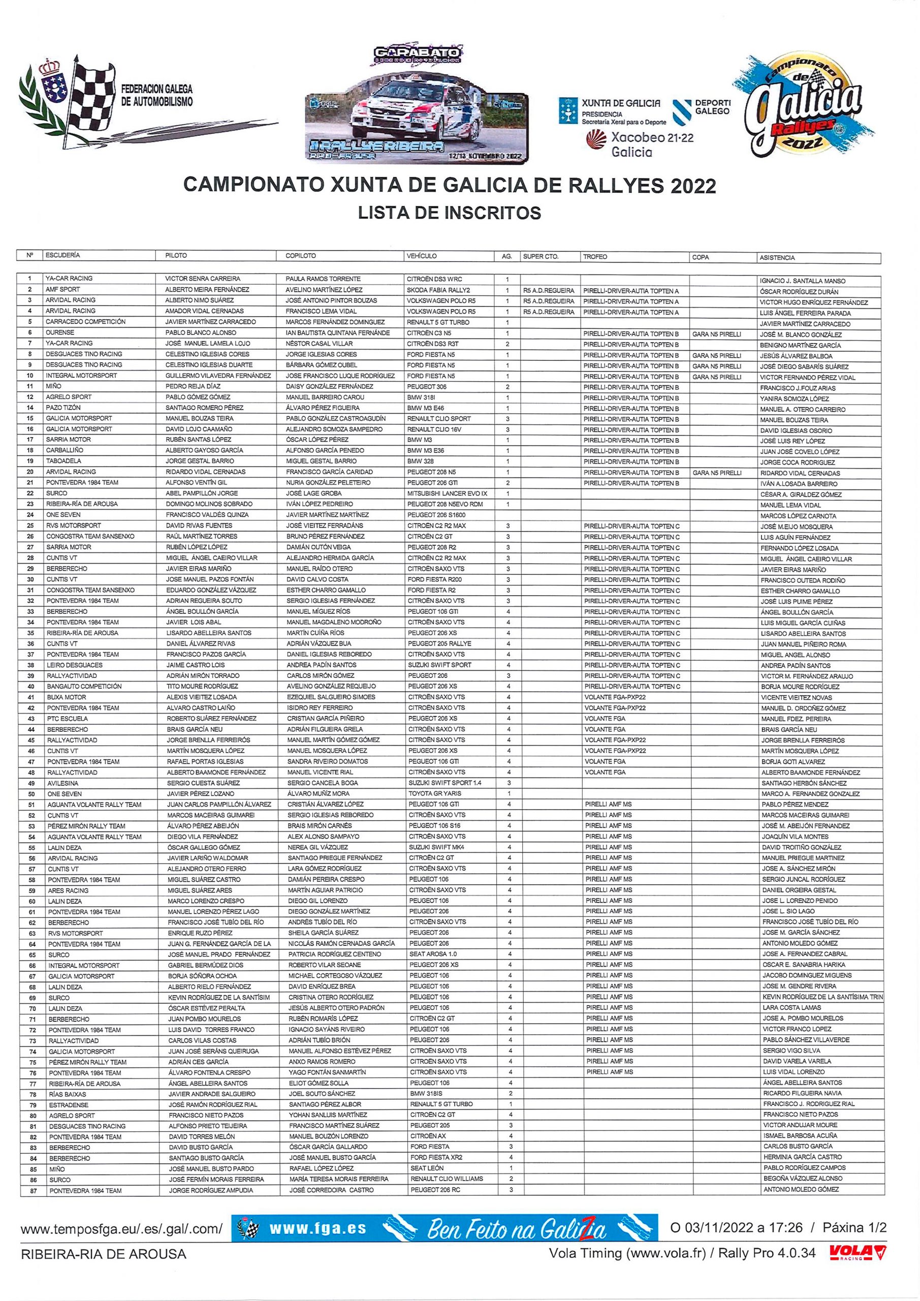 Lista de Inscritos del Rally Ribeira Ria de Arousa 2022