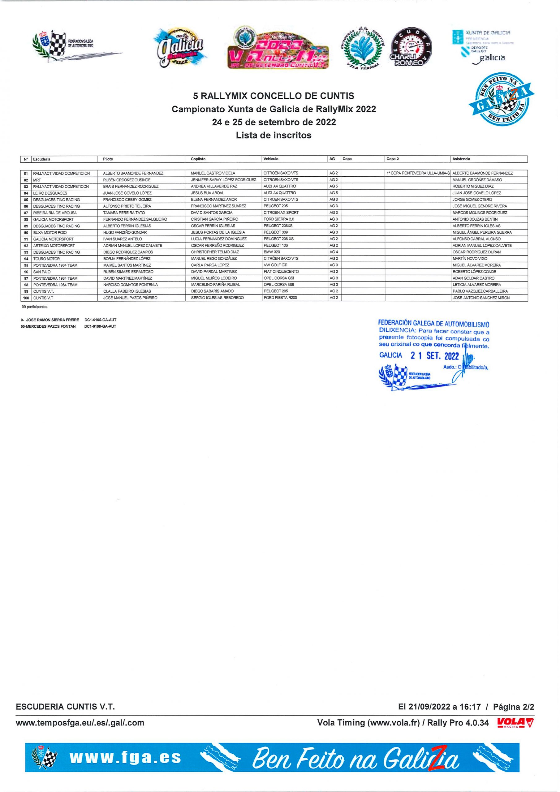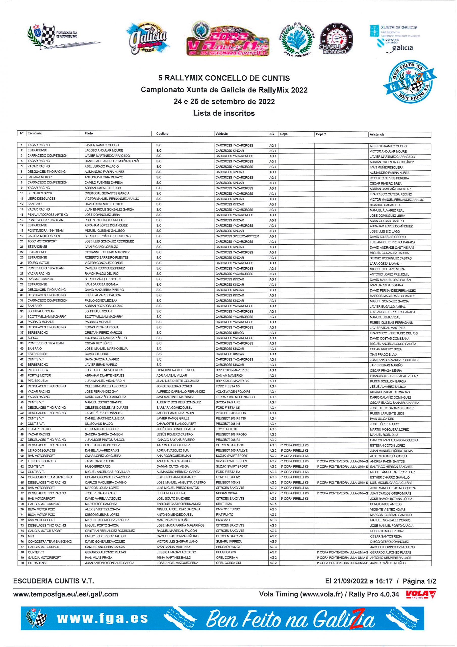 Lista de inscritos del Rallymix Concello de Cuntis 2022