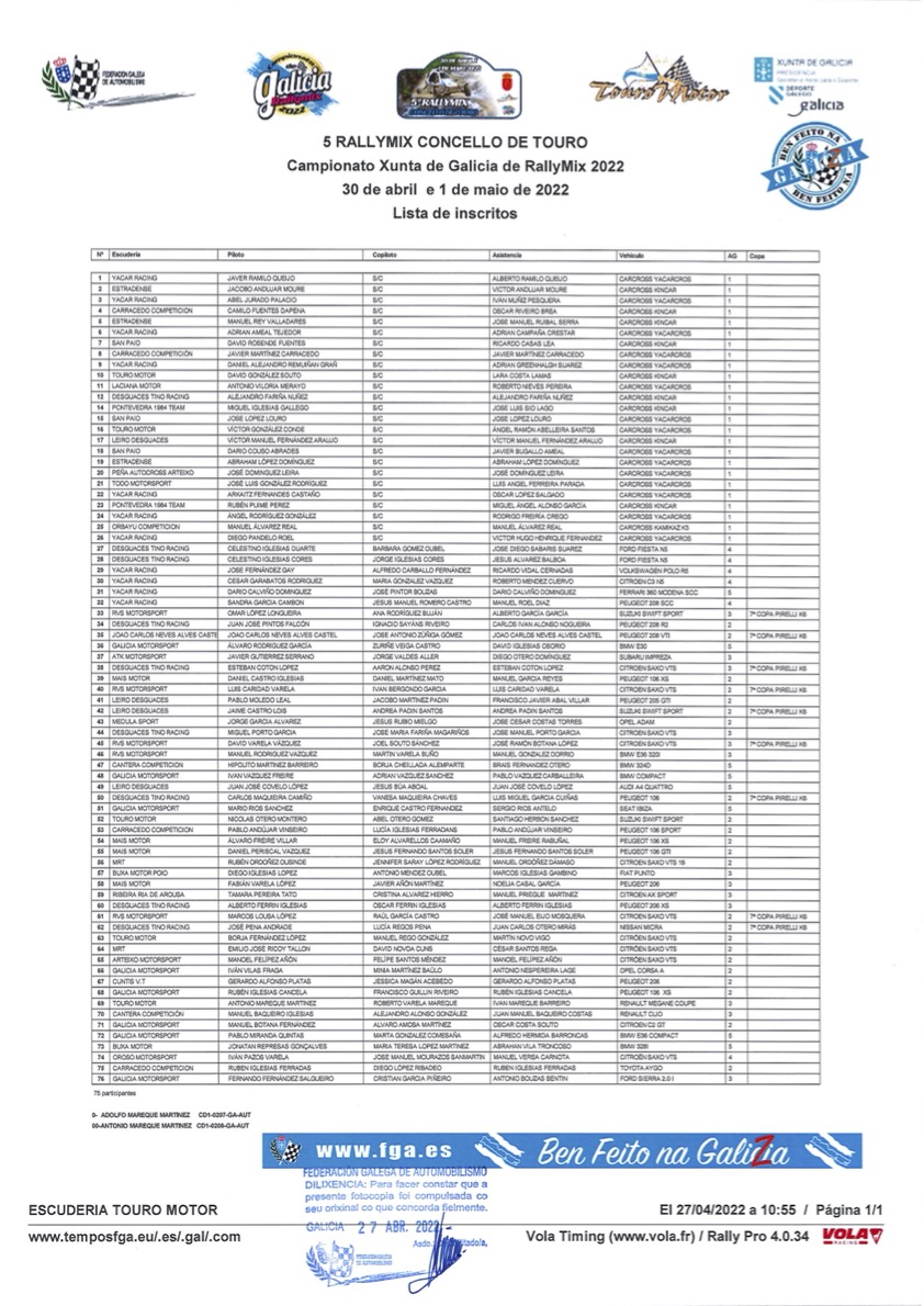 Ya tenemos disponible la lista de inscritos del 5 Rallymix de Touro, prueba puntuable para el Campeonato Gallego de Rallymix.