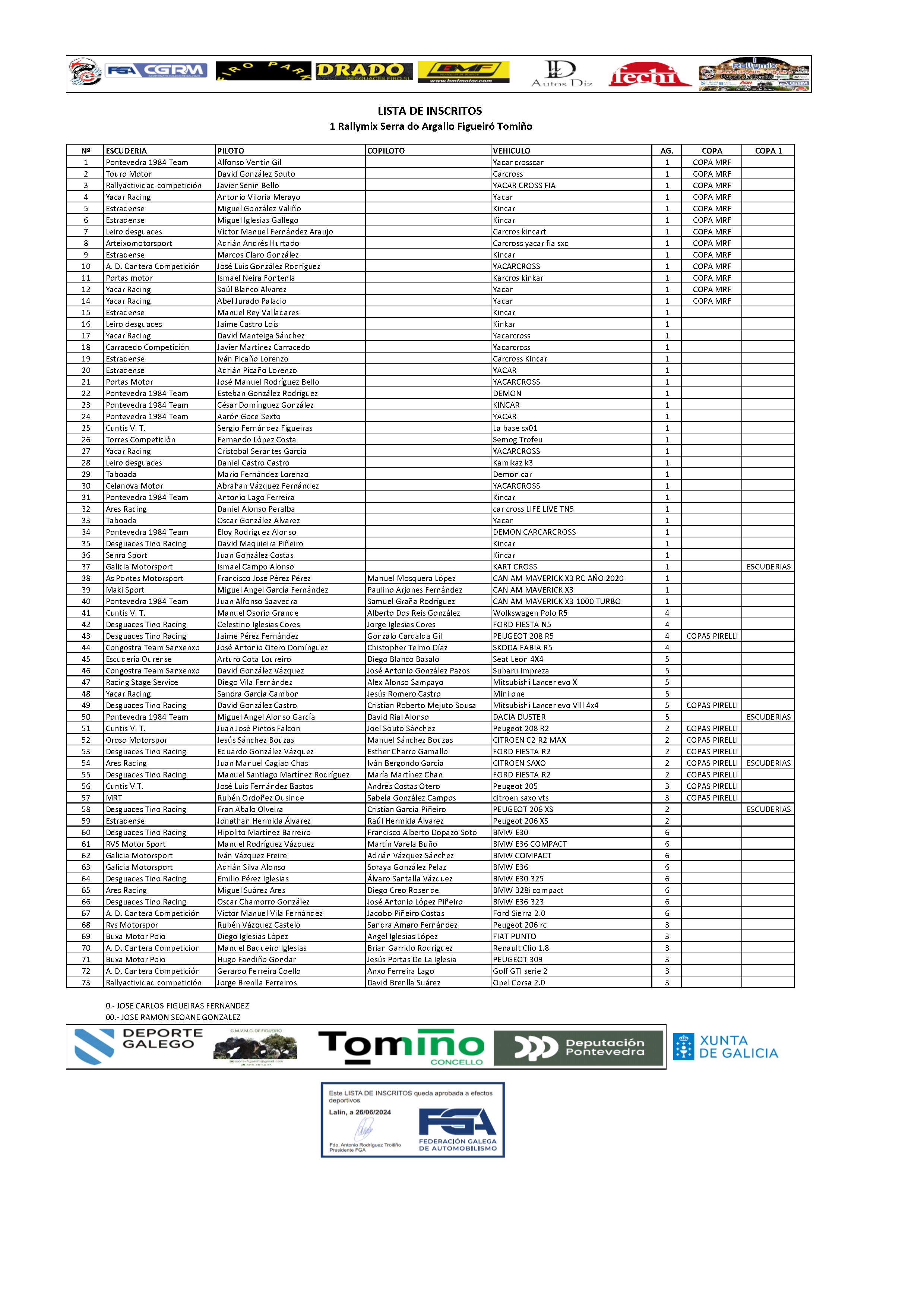 Aquí os traemos la lista de inscritos oficial del Rallymix Serra Argallo – Figueiro 2024, prueba puntuable para el campeonato gallego de la especialidad.