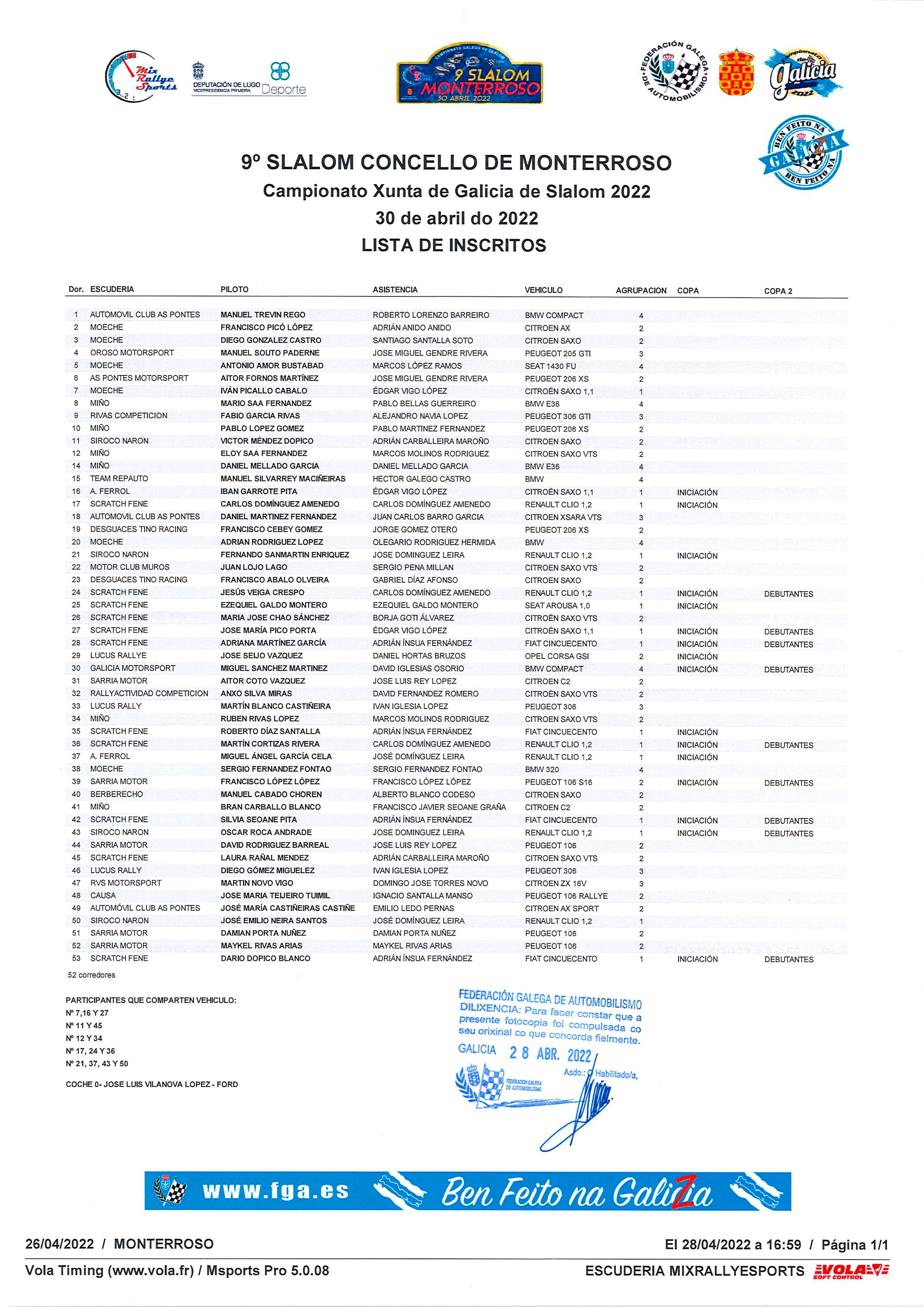Se acaba de hacer publica esta tarde la lista de inscritos del 9 Slalom de Monterroso, prueba puntuable para el Campeonato Gallego de la disciplina.