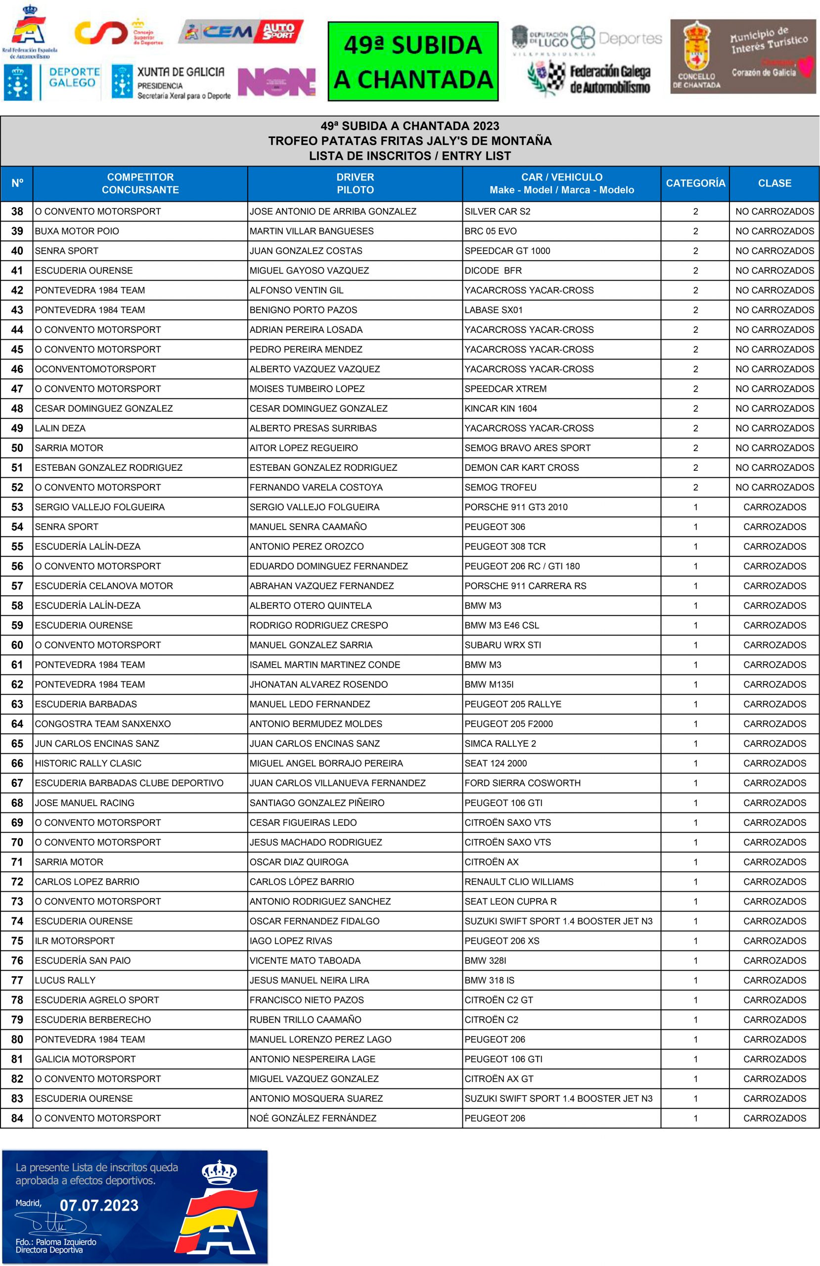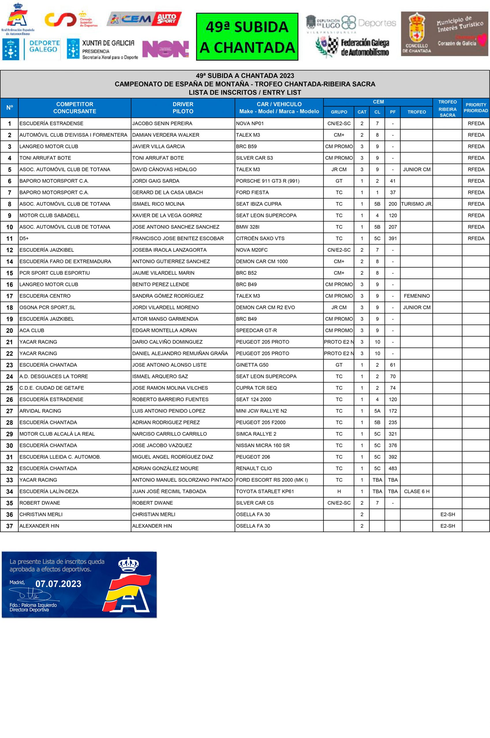 El Comité Organizador de la 49 Subida a Chantada ha publicado la lista de inscritos de la prueba. La cita nacional de Montaña de la Ribeira Sacra contará con pilotos de máximo nivel internacional y con los habituales del Campeonato de España de la especialidad.