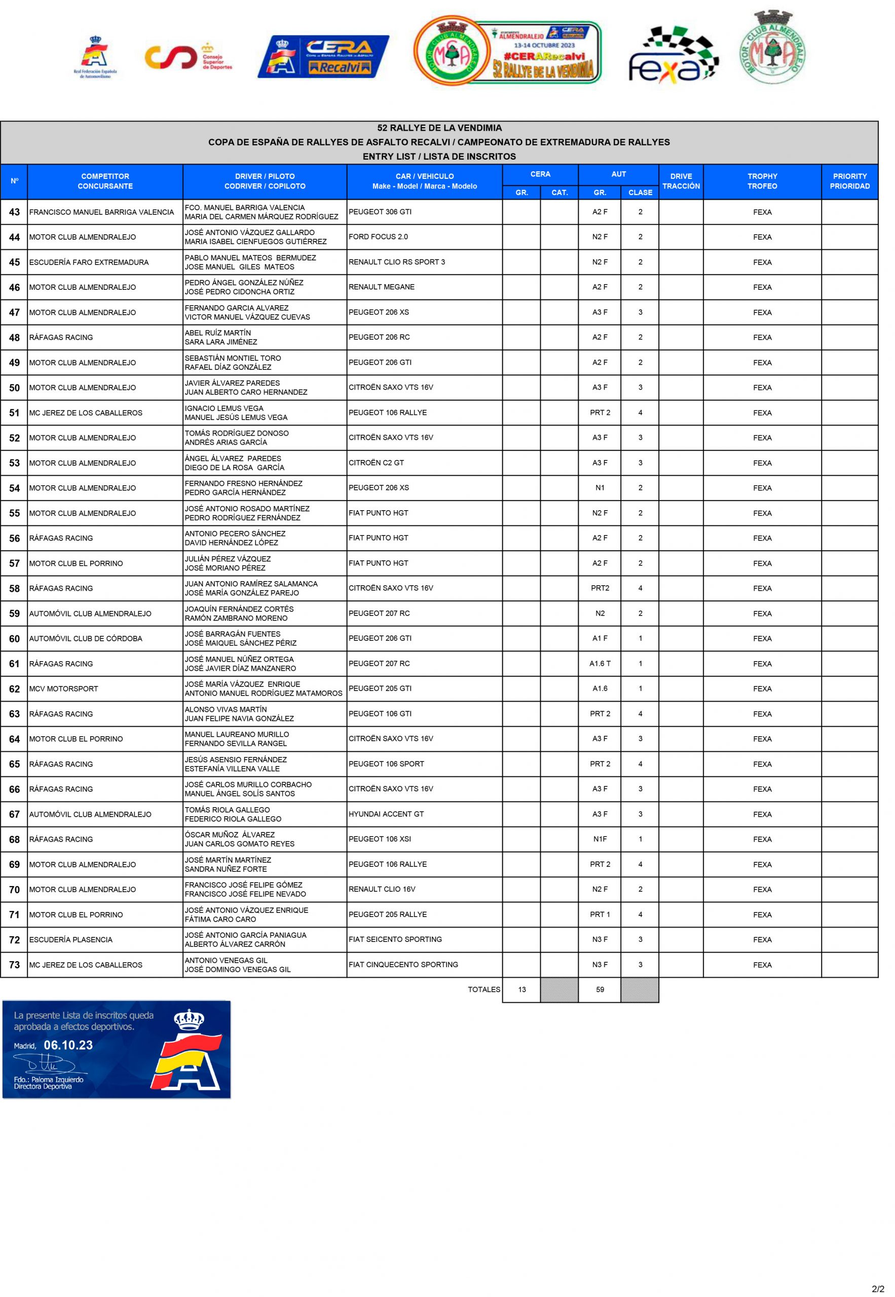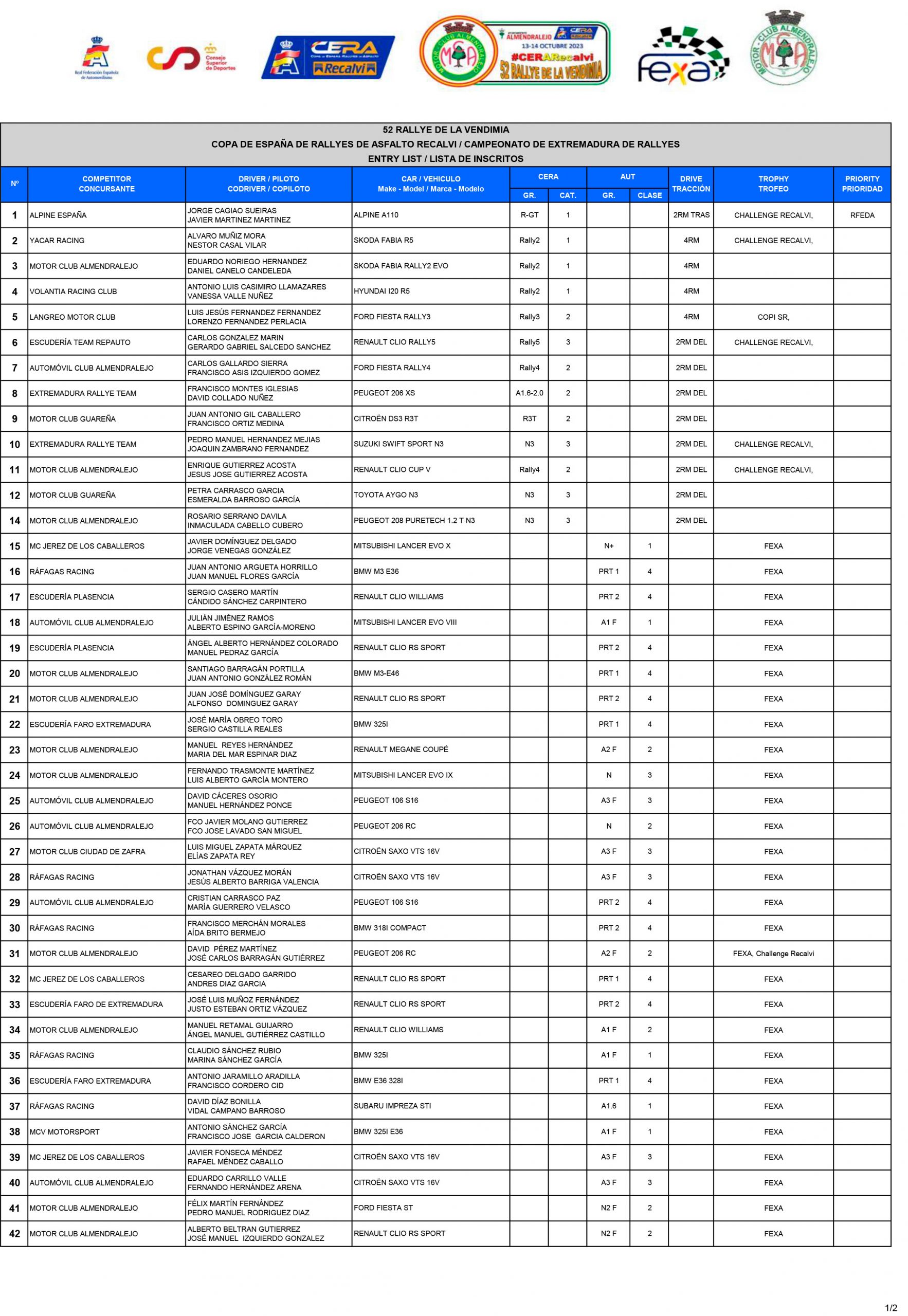El Motor Club de Almendralejo organiza los días 13 y 14 de octubre la 52ª edición del Rallye de la Vendimia, una prueba puntuable para la Copa de España de Rallyes de Asfalto CERA. El rallye contará con 105 kilómetros cronometrados repartidos en cinco secciones y diez tramos.