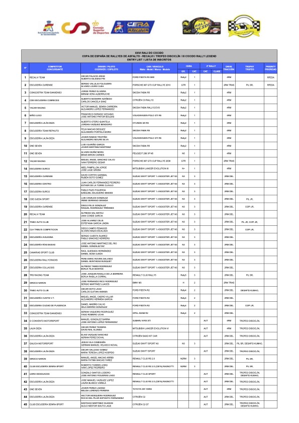 La lista consta de 81 participantes de los cuales 9 son vehiculos Rally2 y también tenemos el siempre espectacular Porsche de Sergio Vallejo.