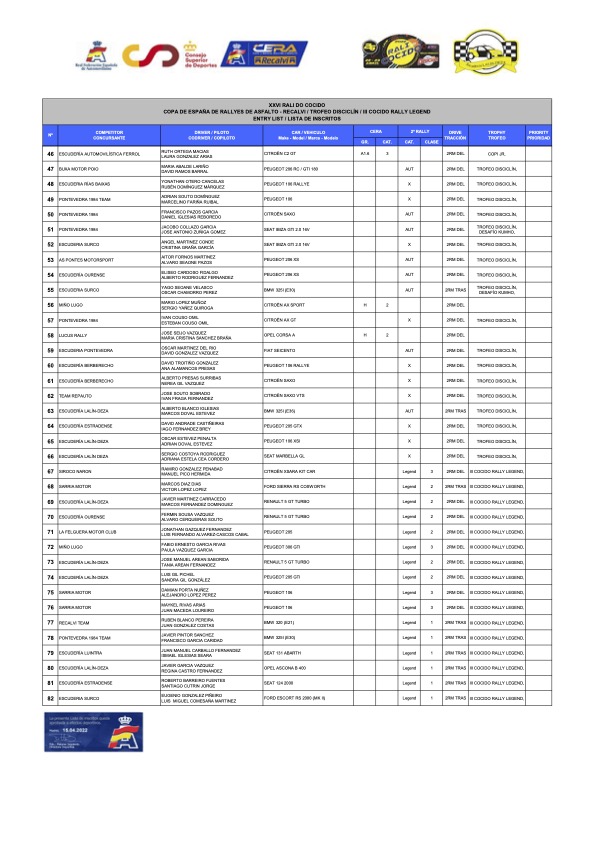 Ya tenemos la lista de inscritos definitiva del Rali do Cocido 2022, prueba puntuable para la Copa de España de Rallyes de Asfalto.