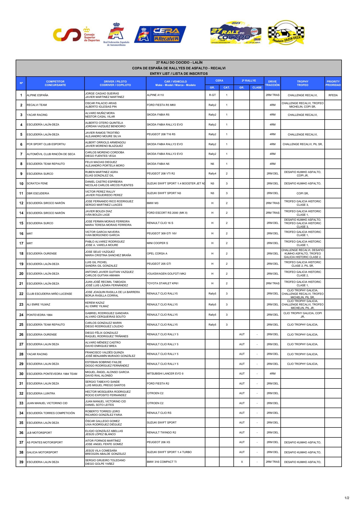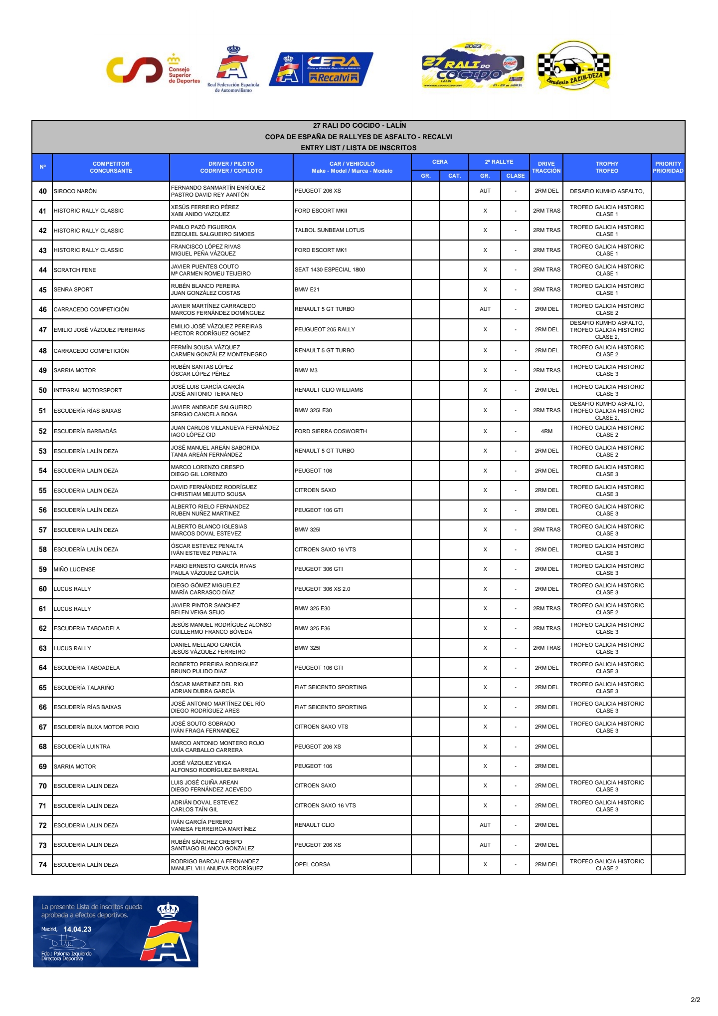 Aqui os dejamos la Lista de inscritos del Rali do Cocido 2023