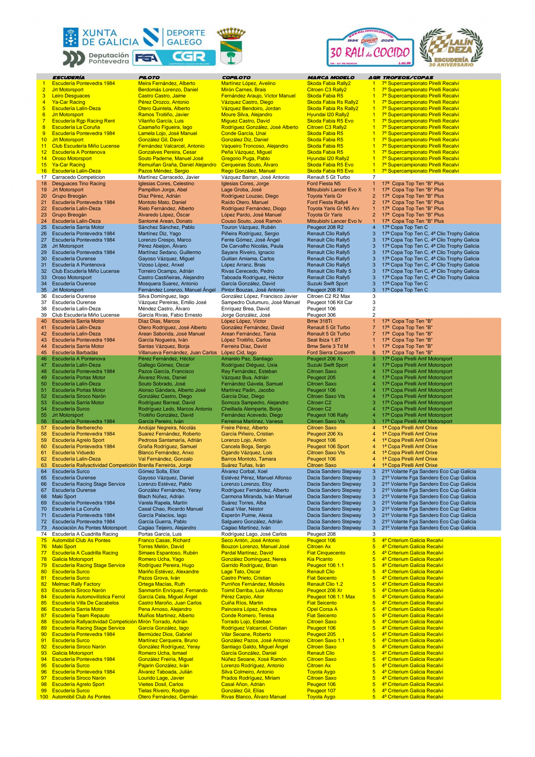 Ya tenemos disponible la lista de inscritos oficial del Rali do Cocido 2026, primera prueba puntuable para el Campeonato Gallego de Rallyes.