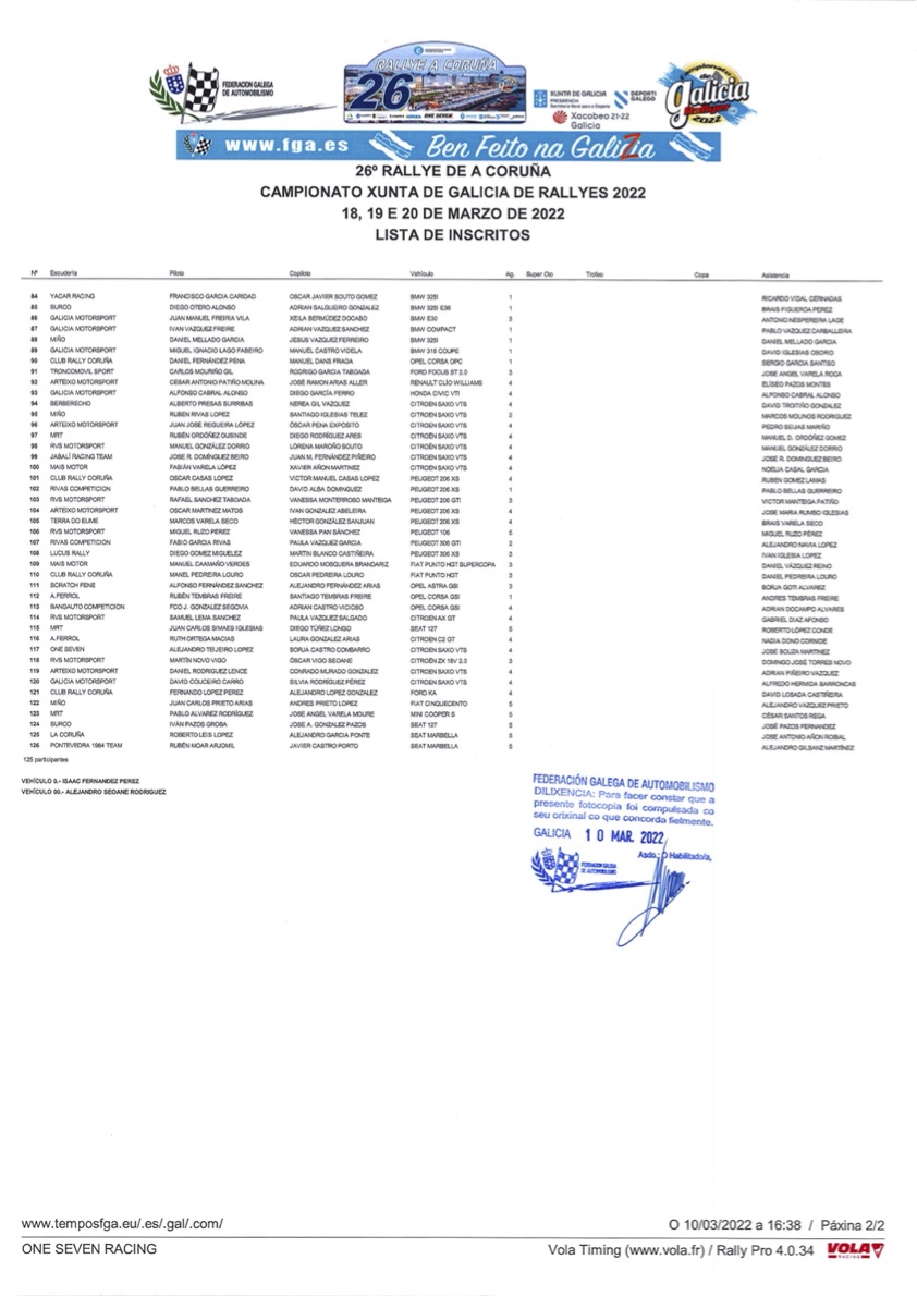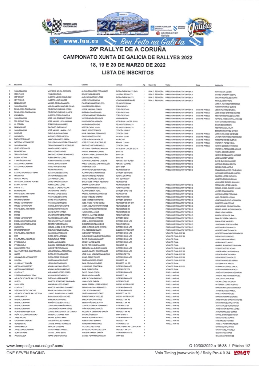 Ya tenemos disponible la lista de inscritos oficial del Rally de A Coruña 2022, prueba inaugural del Campeonato Gallego de Rallyes.