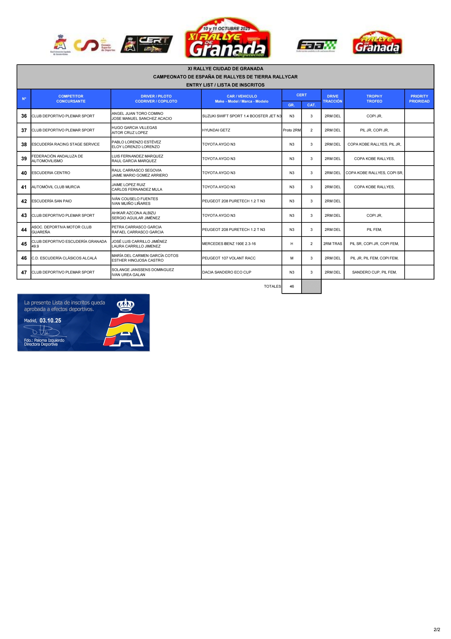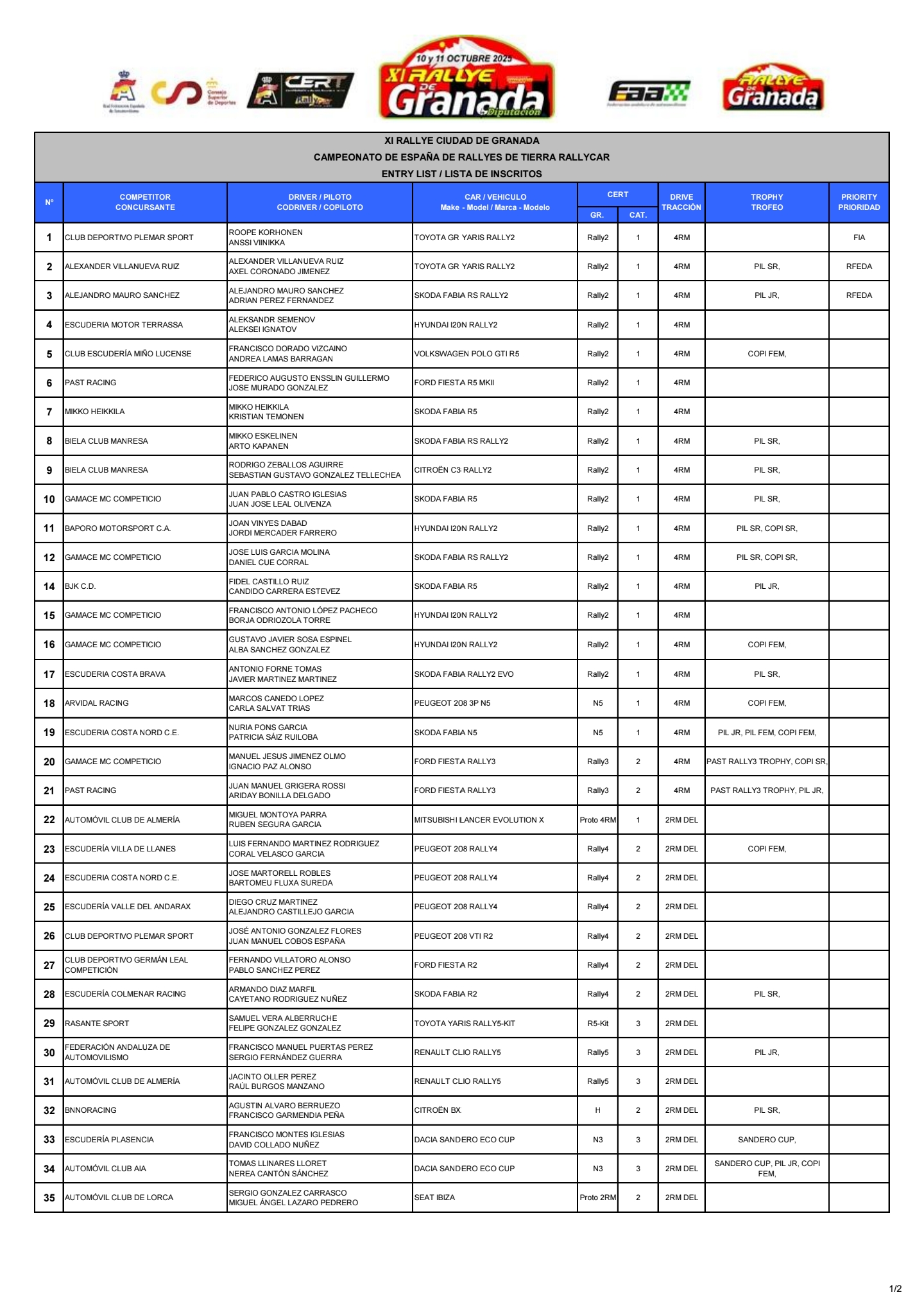 Aquí os traemos la lista de inscritos oficial del Rally Ciudad de Granada by Diputación 2025, prueba puntuable para la Copa de España de Rallyes de Tierra.