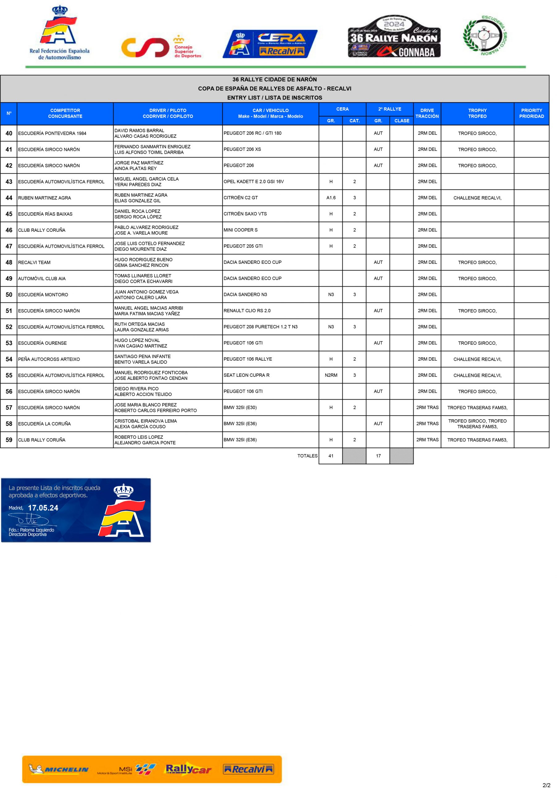 El Rally de Narón, prueba puntuable para la Copa de España de Rallyes de Asfalto, ya tiene disponible la lista de inscritos oficial.