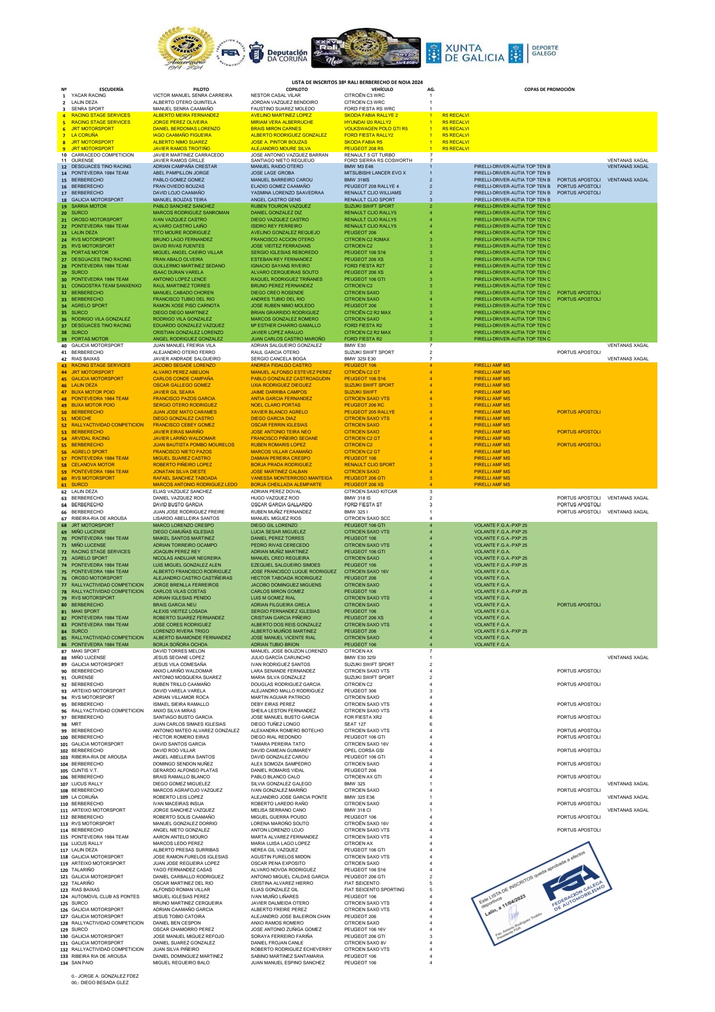 Ya tenemos disponible la lista de inscritos oficial del Rally Berberecho de Noia 2024, tercera prueba puntuable para el Campeonato Gallego de Rallyes.
