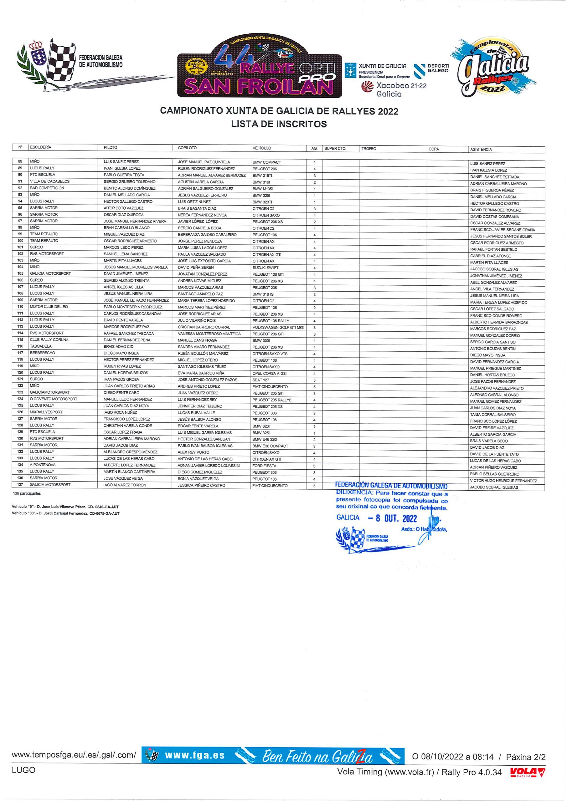 Aquí os traemos la lista de inscritos oficial del Rally San Froilan 2022, prueba puntuable para el Campeonato Gallego de Rallyes: