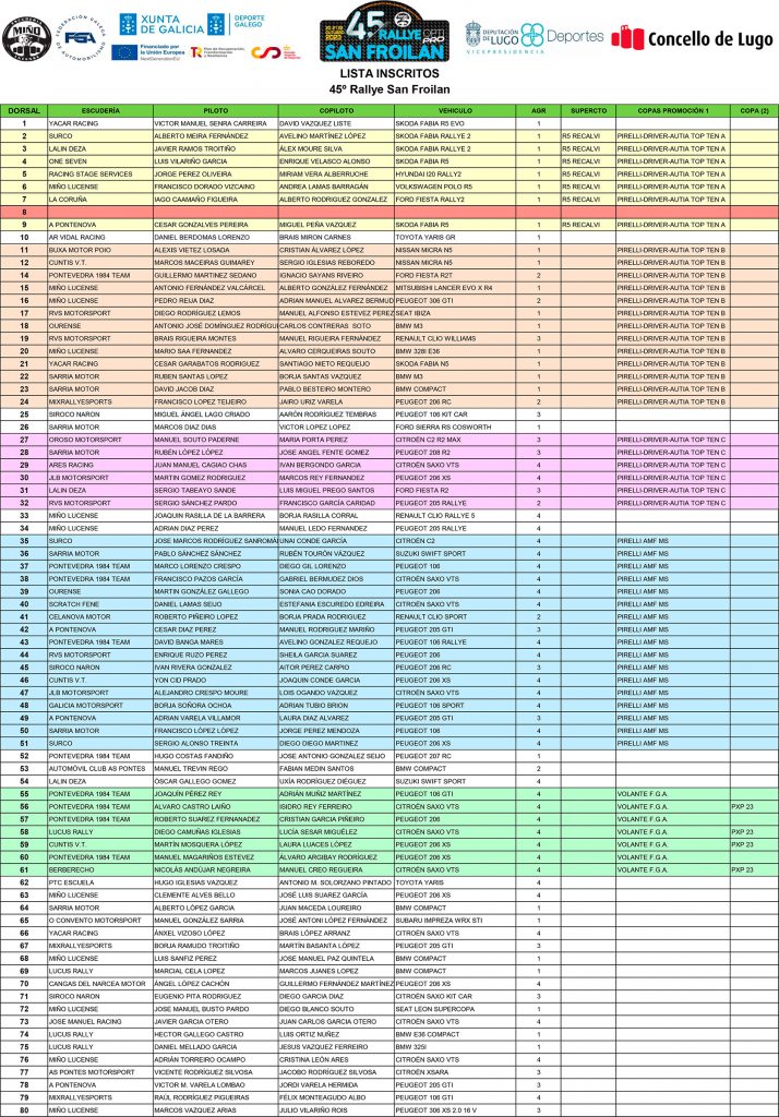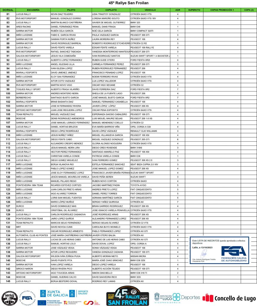 El Rally San Froilán 2023 se celebrará del 20 al 22 de octubre con más de 140 pilotos inscritos. La prueba, organizada por la Escudería Miño, será la penúltima del Campeonato Gallego de Rallyes y podría decidir el título a favor de Víctor Senra, que lidera la clasificación.
