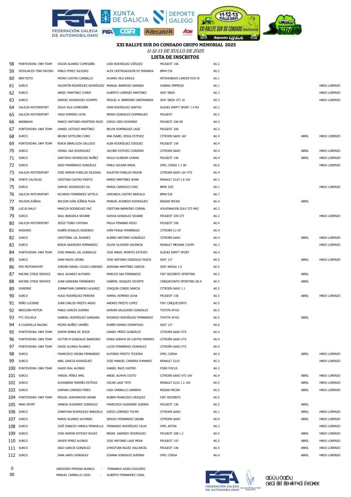 Aquí os traemos la lista de inscritos oficial del Rally Sur do Condado 2025, prueba puntuable para el Campeonato Gallego de Rallyes.