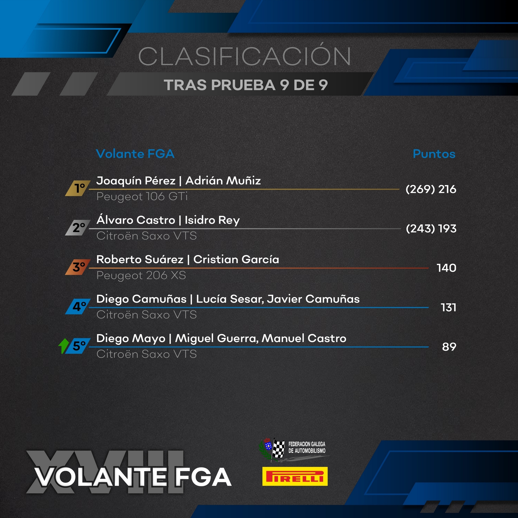 Con mucho protagonismo por parte de los equipos locales se llegaba al último envite de la temporada en el Volante FGA. Con la ausencia del ya campeón Joaquín Pérez, era el turno de Álvaro Castro como gran favorito a la victoria, pero aún así debería pelear contra sus rivales y también contra la mecánica.En el primer tramo el equipo becado ya sufría un pequeño traspiés, pues su coche se apagaba luego de un bache en el que se activaba el cortacorrientes, cediendo algo más de siete segundos, pero después del scratch en el tramo de Rianxo, se ponía líder por delante del también local Roberto Suárez. Por detrás, José Cores y Brais García, ganador el pasado año en esta carrera, se enfrascaban en una lucha por el tercer escalón del podio, que posteriormente sería el segundo tras el abandono de Roberto Suárez por avería.
