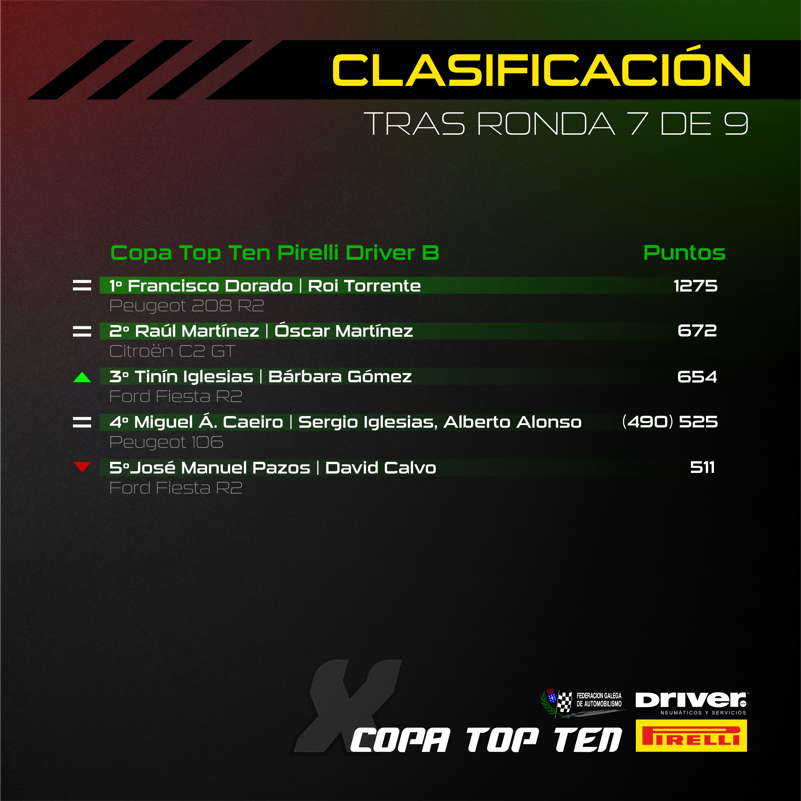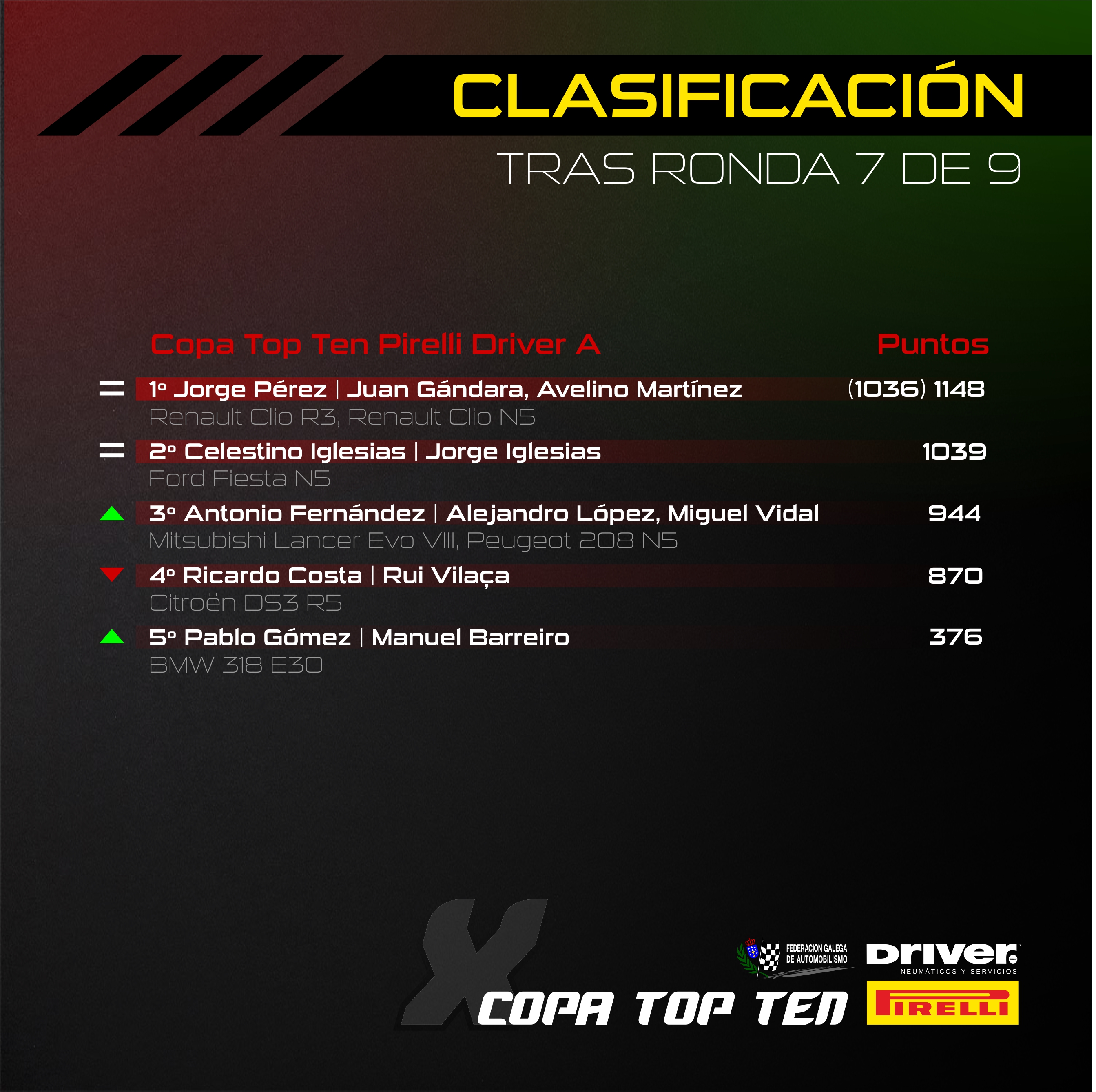 La Copa Top Ten Pirelli Driver A llegaba a Luintra con la ausencia de Ricardo Costa, cuyo DS3 R5 no pudo estar listo a tiempo para la prueba ourensana. Así las cosas, Jorge Pérez, Tino Iglesias y Antonio Fernández iban a pelear por sus opciones al título, aunque lo cierto es que el piloto de Salceda no dio opción a sus dos rivales, distanciándose progresivamente con el paso de los tramos hacia la victoria. La batalla entre Iglesias y ’Ventura’ fue un continuo toma y daca, llevándose el de Castroverde la segunda posición final por sólo 4 segundos. Por detrás, Pablo Gómez y Miguel Ángel Alonso completaban el top 5.