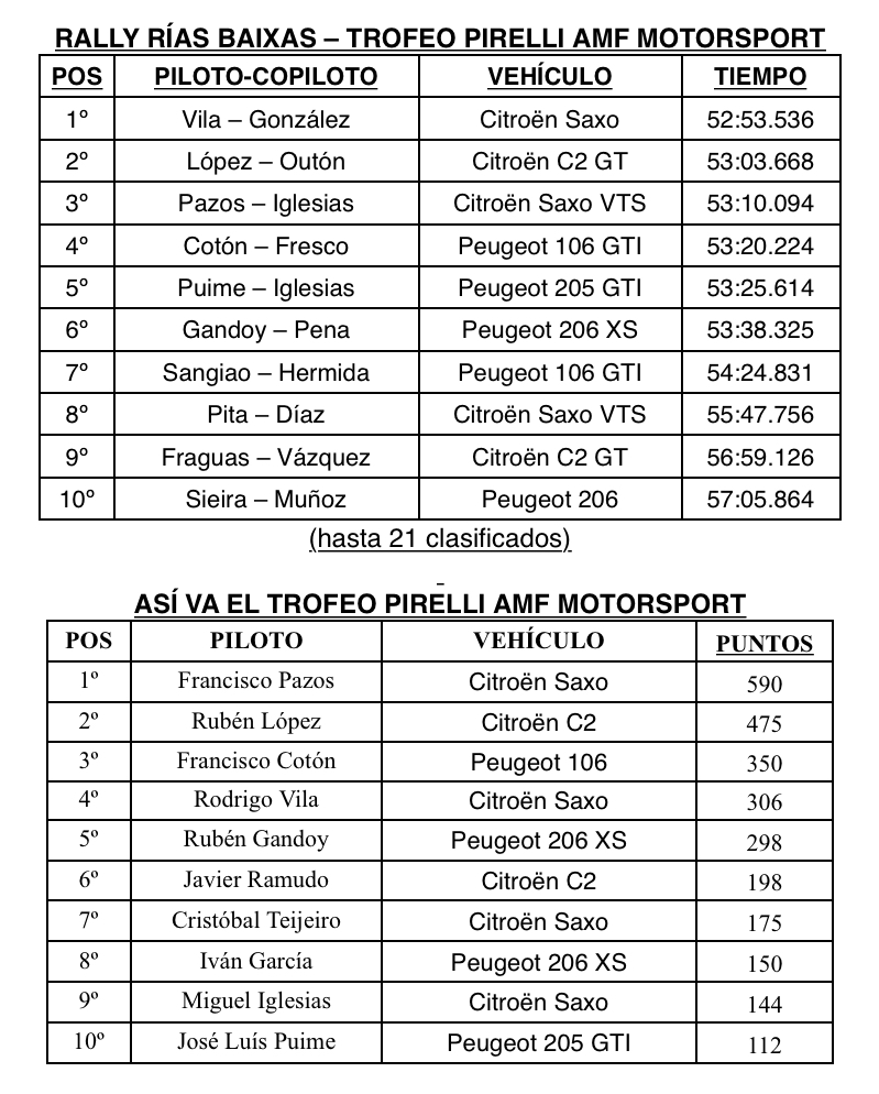 En total, 16 de los 20 equipos que tomaron la salida consiguieron completar el recorrido del emblemático rally, en el que los cinco primeros clasificados acabaron en poco más de medio minuto, buena prueba del gran nivel e igualdad del trofeo promocional Pirelli AMF Motorsport. Por detrás de Vila, López y Pazos acabaron Francisco Cotón y José Luís Puime, cuarto y quinto respectivamente.
