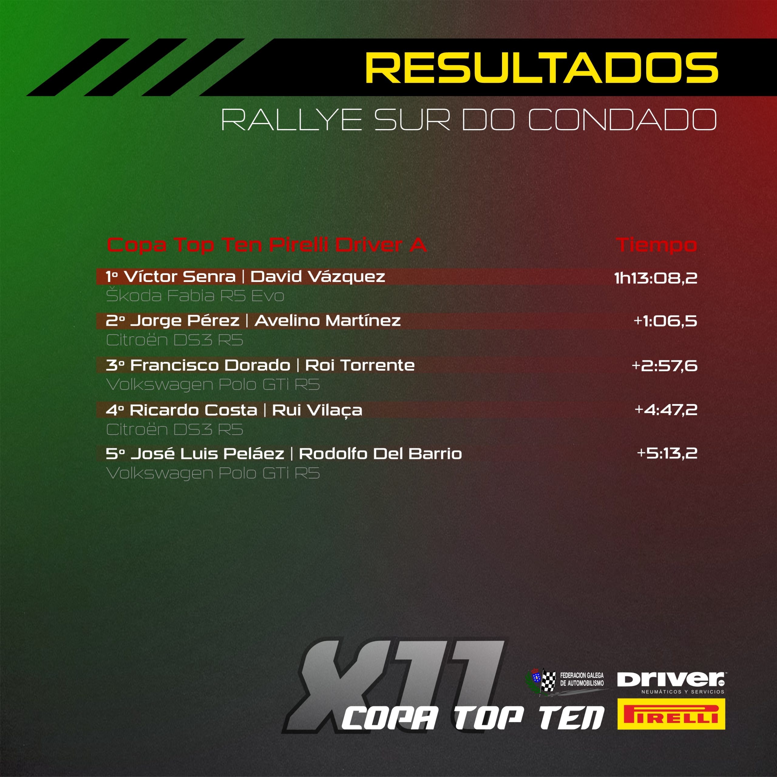 En la Copa Top Ten Pirelli “A” y el Supercampeonato Gallego R5, Víctor Senra y David Vázquez dominaron de principio a fin para llevarse el tercer triunfo de tres posibles. La principal oposición recayó en Alberto Meira, que apenas había cedido tiempo en las dos primeras especiales pero se veía obligado a la retirada en la tercera tras romper una rótula. Por detrás, Jorge Pérez realizó una sobresaliente actuación en casa para repetir de nuevo en la segunda plaza, mientras Paco Dorado se debía conformar con el último peldaño del podio. Rallye aciago para Iago Caamaño, que con multitud de problemas terminaba sexto por detrás de Ricardo Costa y el madrileño José Luis Peláez.