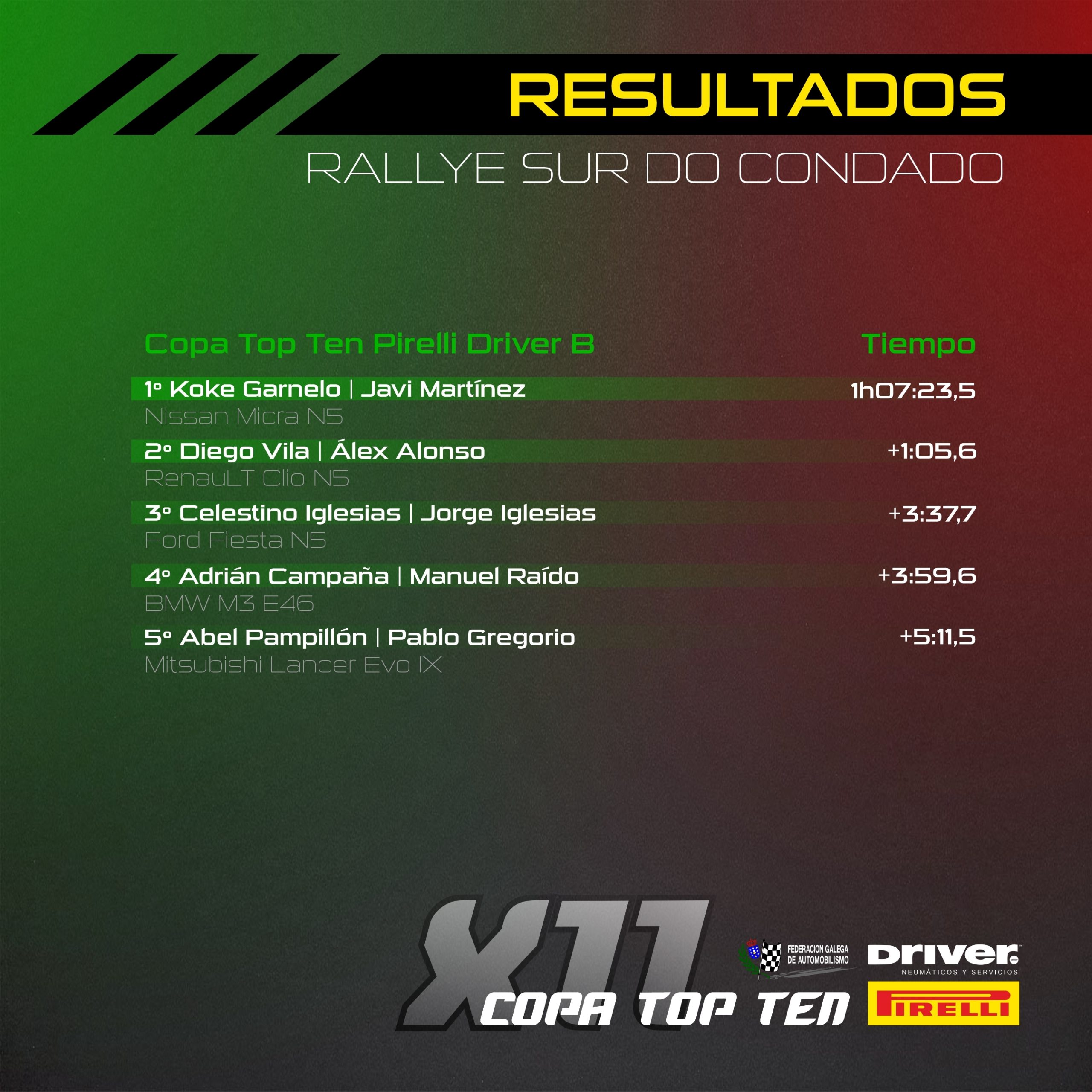 La tercera cita de la temporada en el Campeonato Gallego, el Rallye Sur do Condado, iba a deparar un desafío para los participantes de las tres divisiones de la Copa Top Ten Pirelli Driver, debido a lo extenso y caluroso de la jornada de competición.