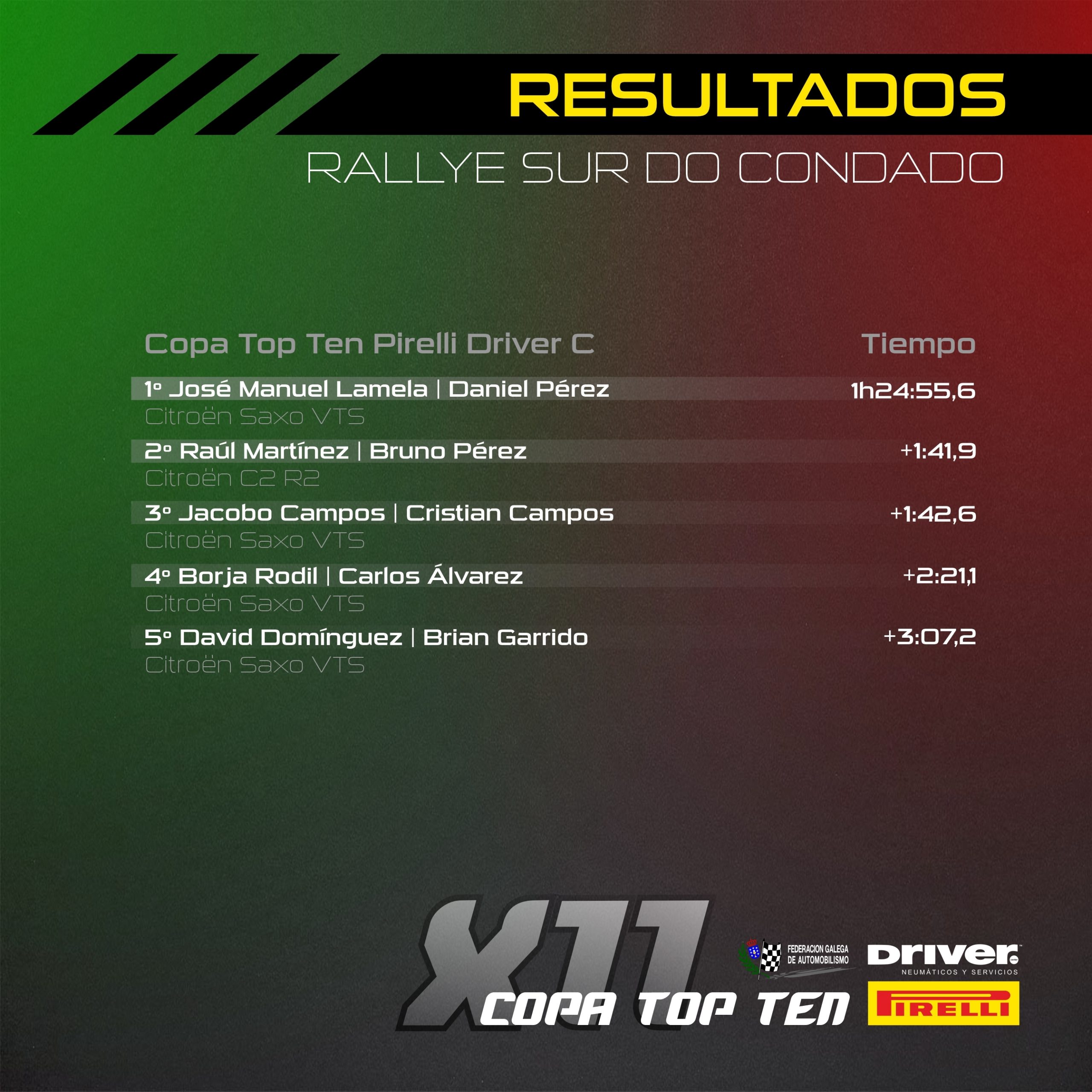 La Copa Top Ten Pirelli “C” fue un auténtico descalabro entre los vehículos de la clase R2, que irían cayendo uno a uno, destacando el abandono del líder del certamen, ‘Tinín’ Iglesias, por salida de carretera. La pelea por el triunfo fue cosa de Raul Martínez, líder en la matinal, Rubén López que asaltaba el liderato tras el ecuador, y José Manuel Lamela, que copilotado por Daniel Pérez se hacía finalmente con el triunfo en un rallye sin sobresaltos y de menos a más. Martínez terminaba segundo tras solventar