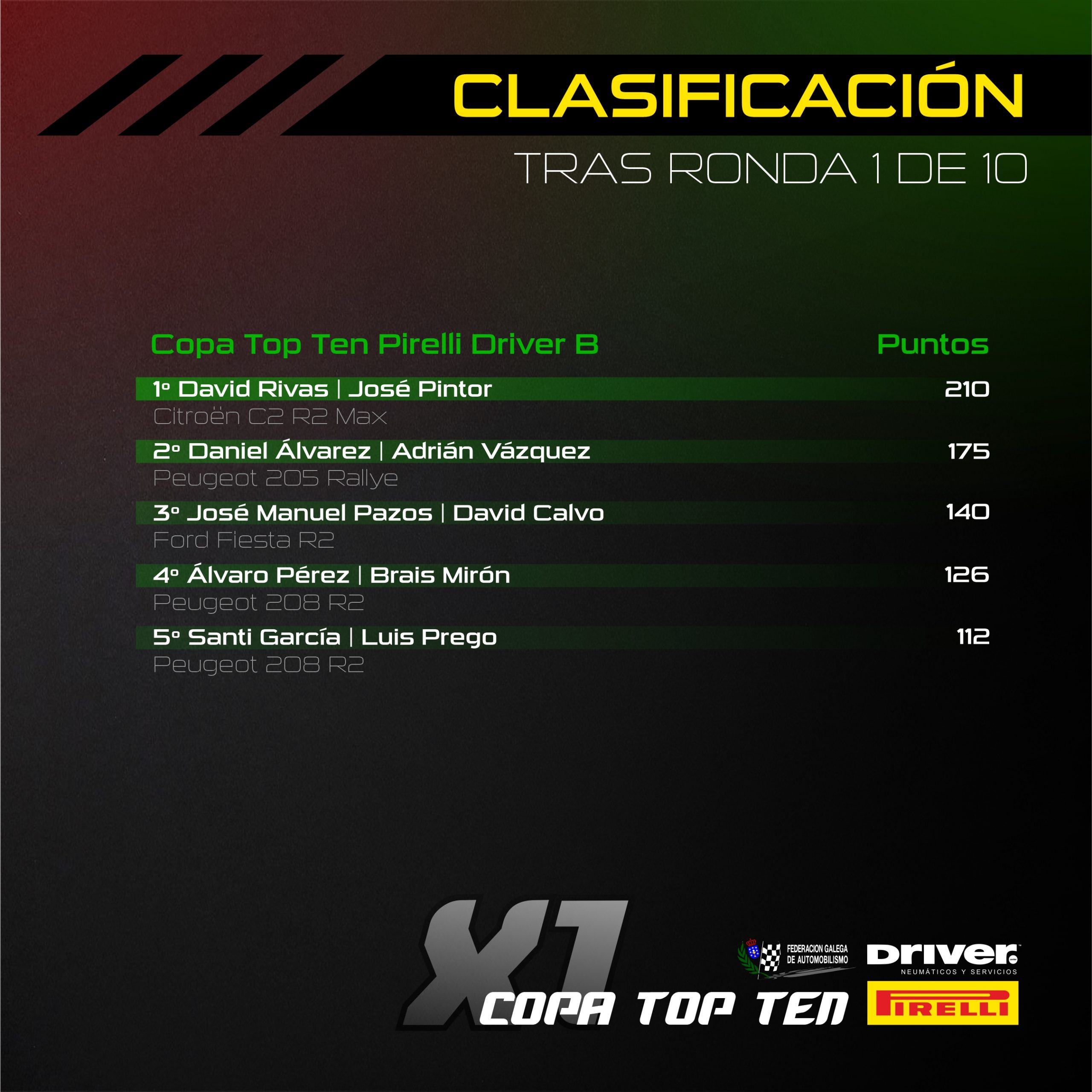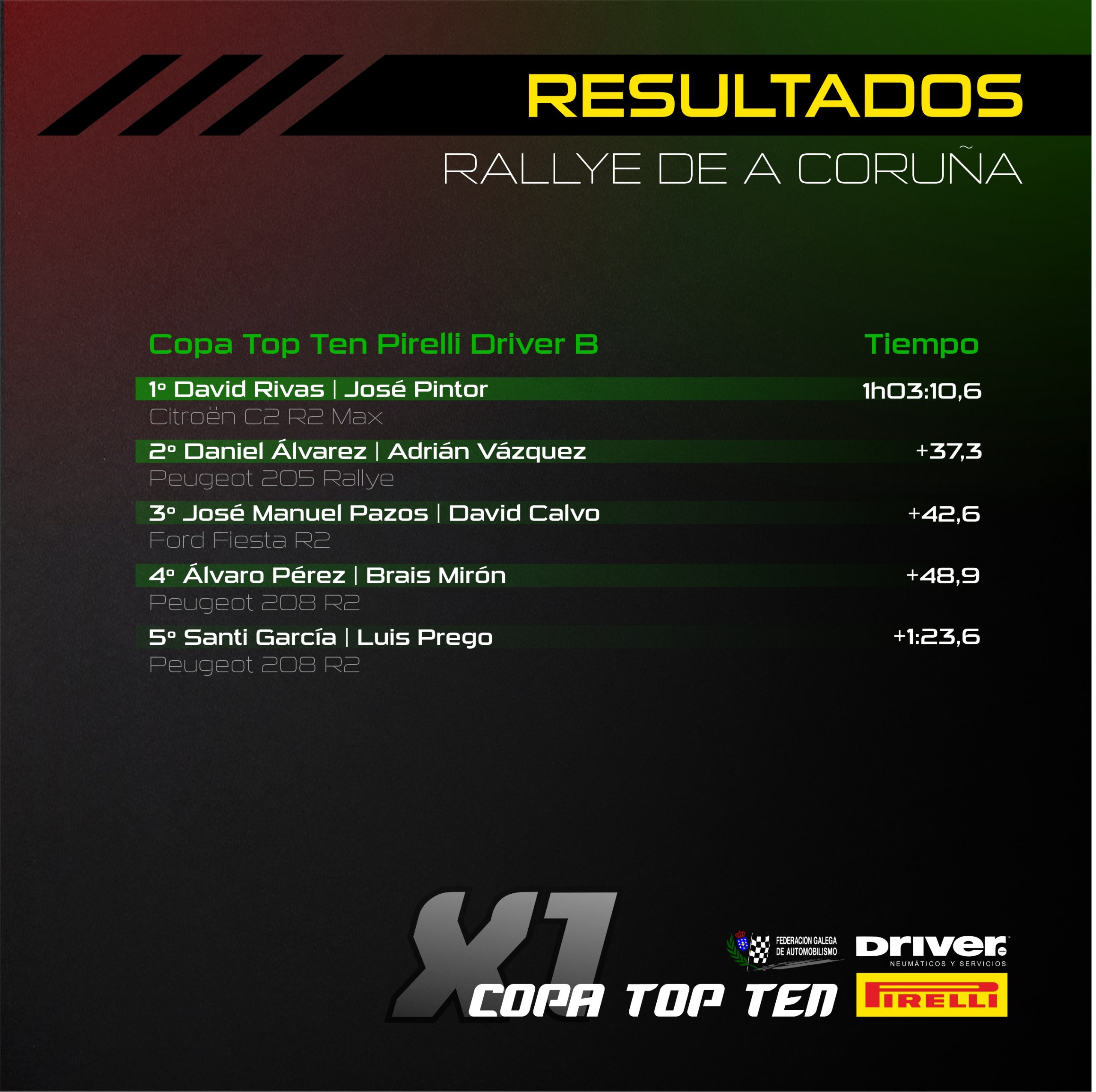 En lo que respecta a la Copa Top Ten Pirelli Driver B, David Rivas continuaba con la senda victoriosa del Mariña Lucense y se sacaba la espina del rallye de casa, triunfando con solvencia tras una jornada perfecta por su parte. Por detrás del piloto de Cerceda, José Manuel Pazos y Dani Álvarez se jugaban la segunda posición, llevándose Álvarez el gato al agua tras una buena actuación en el último bucle.