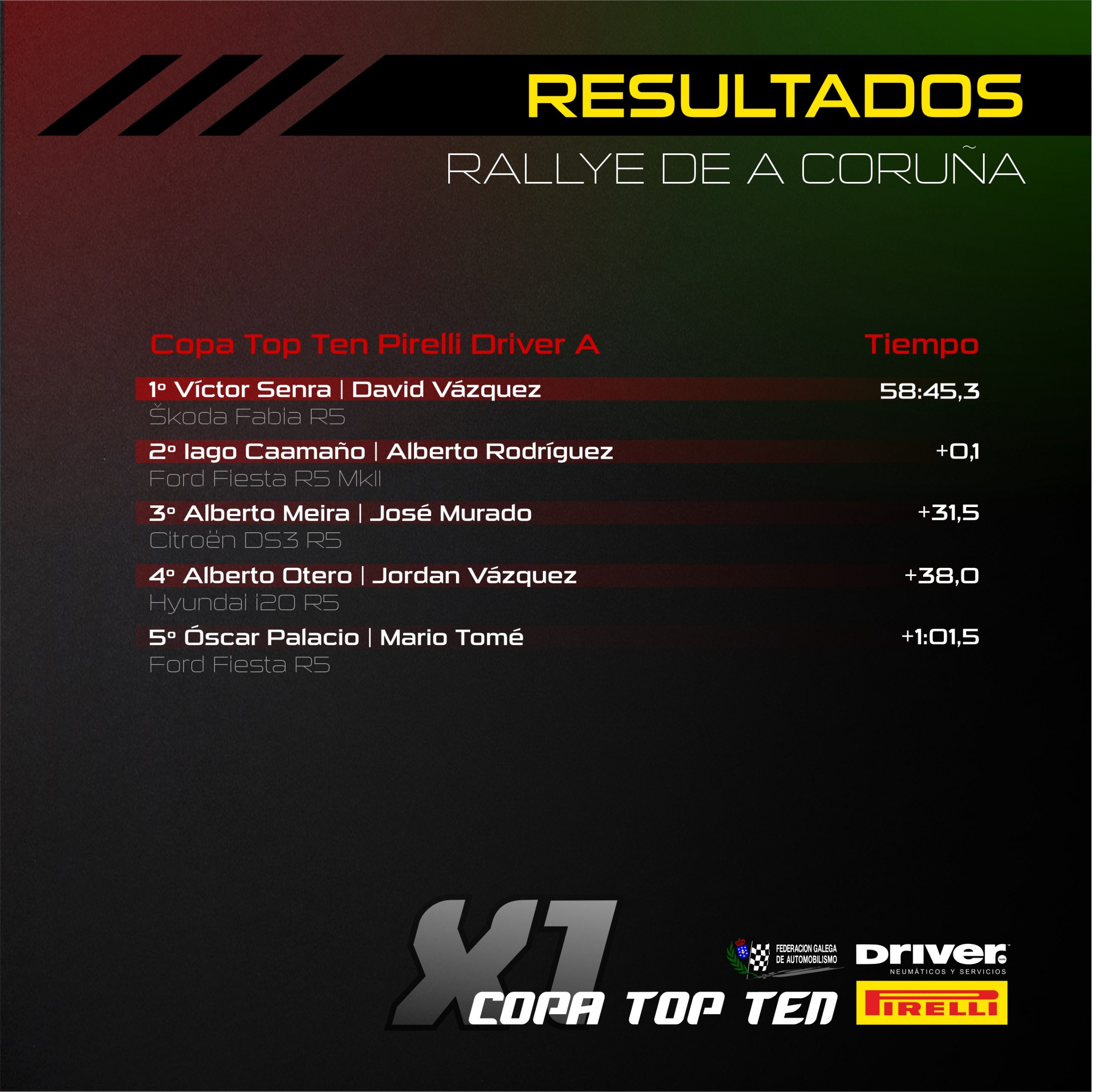 La Copa Top Ten Pirelli Driver A contaba con una sobresaliente cantidad de vehículos R5, once para ser exactos, los más rápidos de los cuales se batirían el cobre por la victoria absoluta. Comenzaba entonces un intenso duelo entre Víctor Senra e Iago Caamaño, con ventaja para el de Dumbría al principio, pero que se diluía tras romper un pasador de la palanca de cambios. Se llegaba al último bucle con una cómoda ventaja de 19 segundos para Caamaño, así que Senra decidía arriesgar con la monta de neumáticos y en un último tramo agónico arrebataba el triunfo al coruñés por poco más de una décima de segundo.