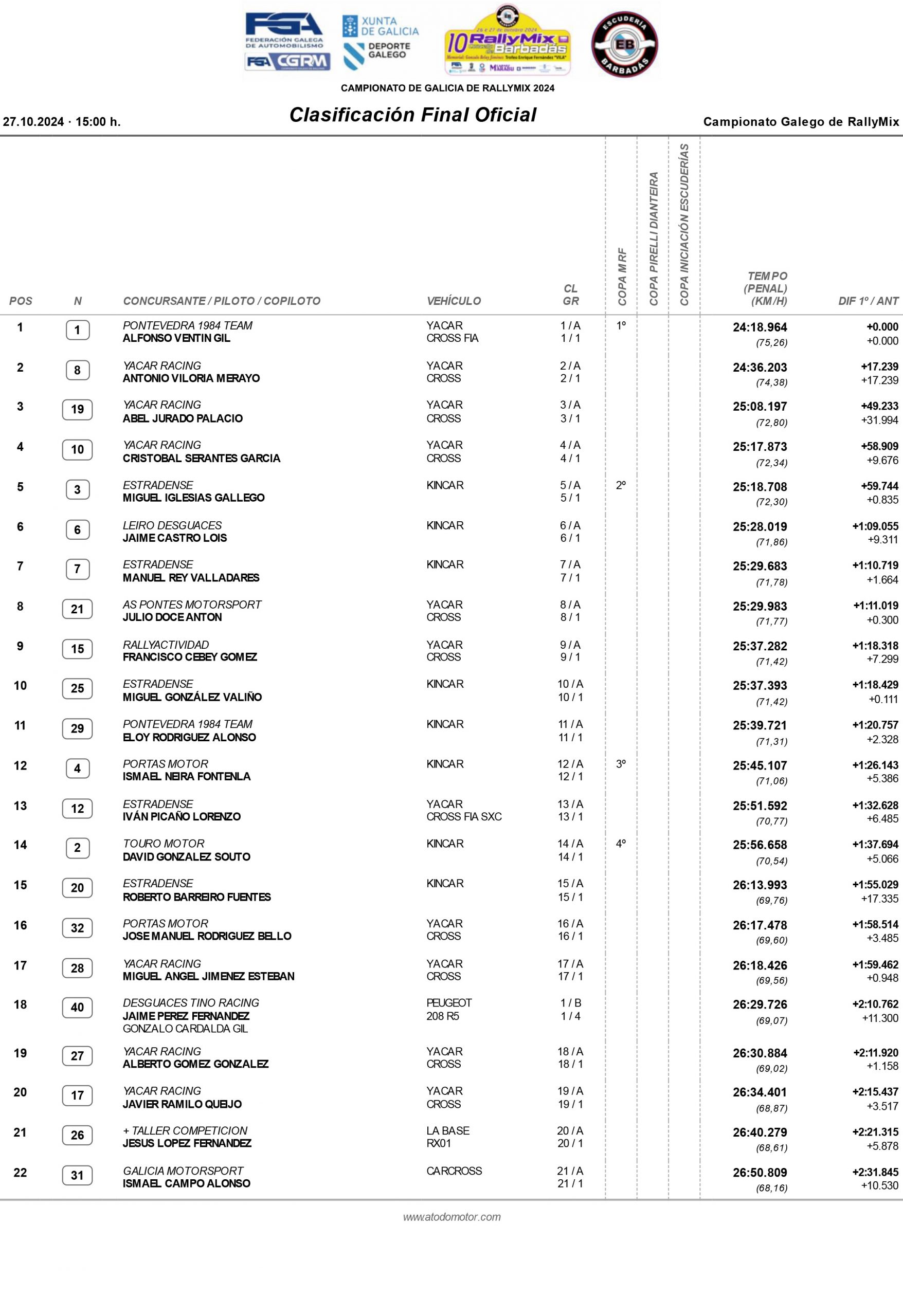 El Campeonato Gallego de Rallymix concluyó con la séptima y última prueba en Barbadás, donde Alfonso “Pisko” Ventín (Yacarcross) y el dúo Jaime Pérez y Gonzalo Cardalda (Peugeot 208 T16 R5) se alzaron con la victoria en las clases A y B, respectivamente.